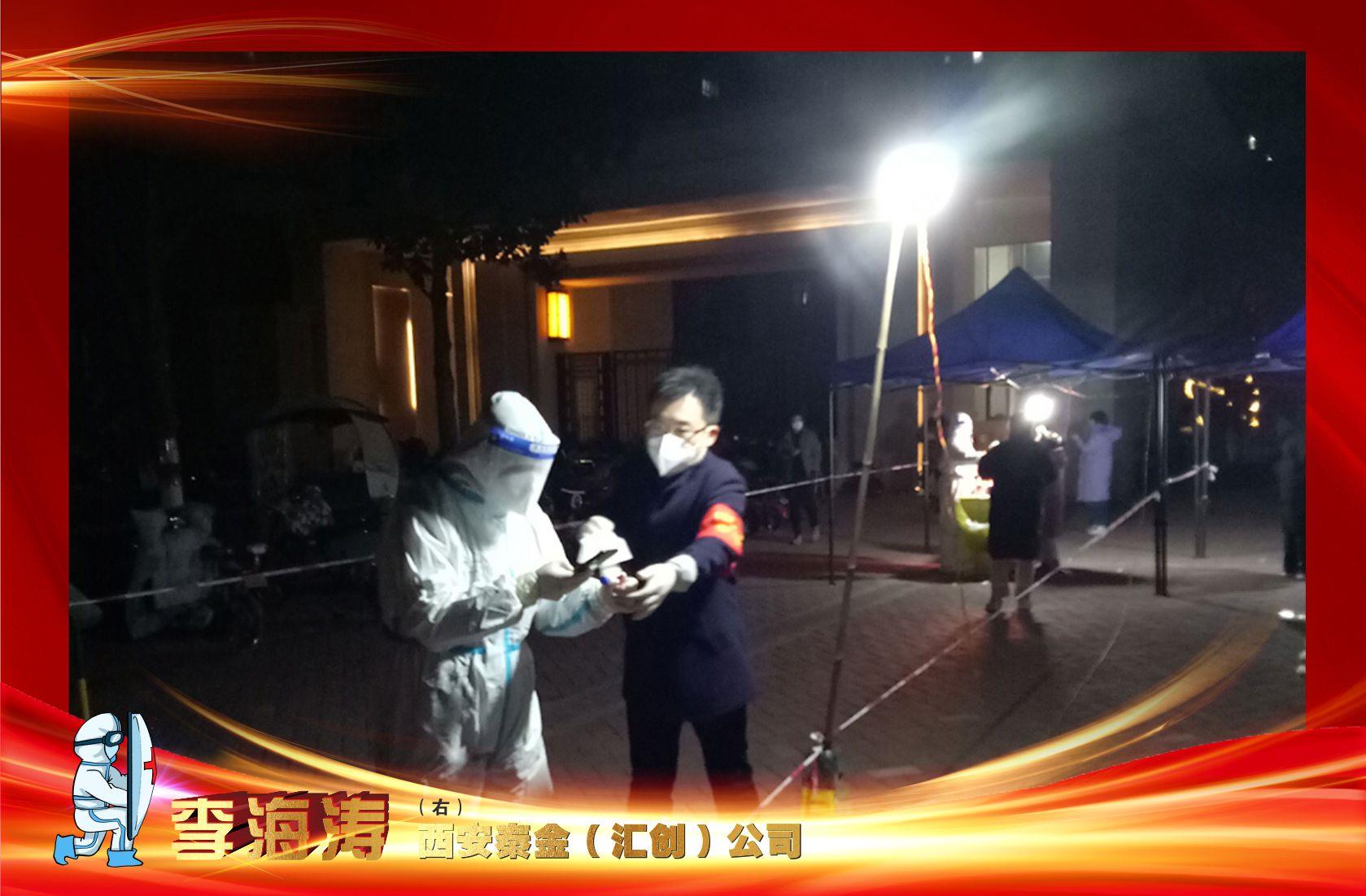 晚上9點多,在延興門社區(qū)海倫國際小區(qū)值勤的黃金集團西安秦金(匯創(chuàng))公司副總經(jīng)理李海濤反復核實核酸檢測信息。夜里氣溫低,他冷的想打哆嗦,手指頭僵硬的像沒了感覺。跺跺腳、搓搓手,寒風里始終堅守著崗位,只為更多的家庭“宅”的放心,睡的安穩(wěn)。