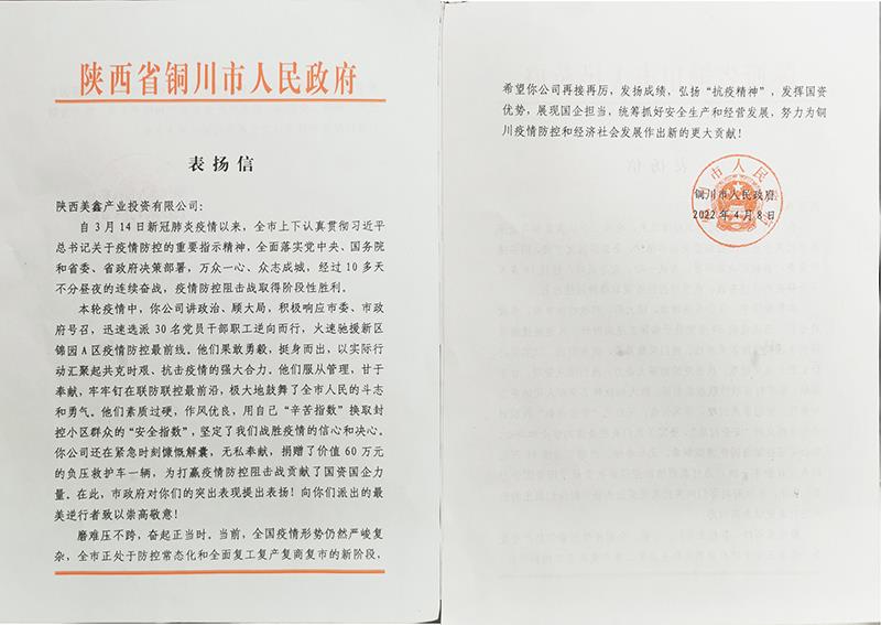 4月上旬,銅川市人民政府向陜西美鑫公司發(fā)來一封《表揚信》,對該公司積極參與銅川市3.14疫情防控工作付出的努力和做出的貢獻(xiàn)表示高度的贊揚,對主動擔(dān)當(dāng)、勇于作為,防疫情、穩(wěn)生產(chǎn)取得的成績給予充分肯定。