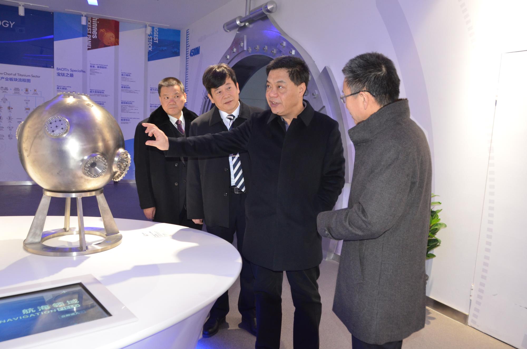 陜西有色金屬集團(tuán)黨委書記、董事長(zhǎng)馬寶平(左三)到寶鈦集團(tuán)指導(dǎo)科技創(chuàng)新工作。