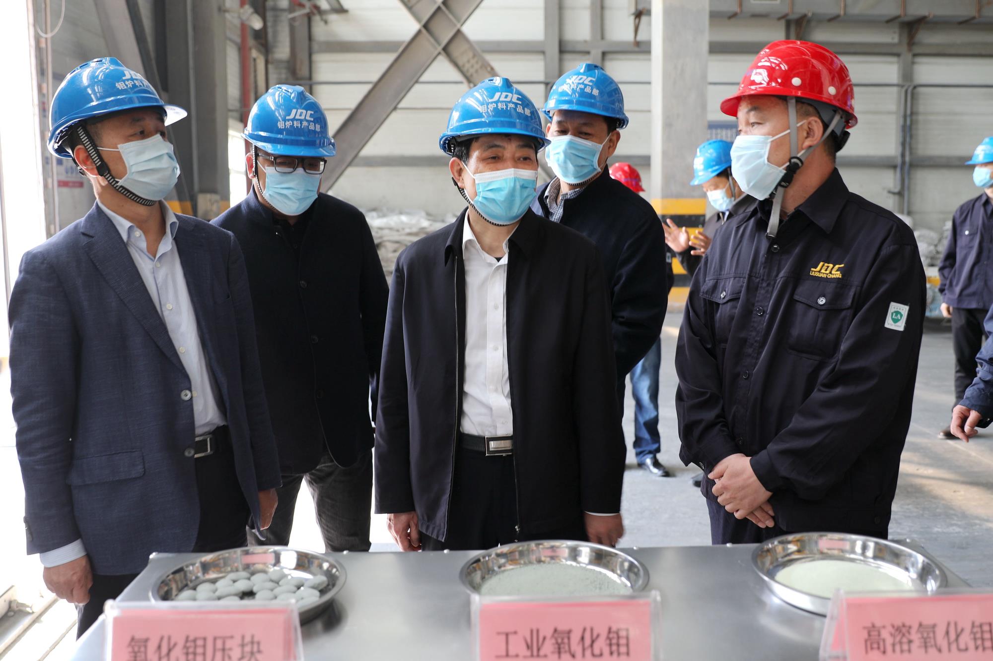 陜西有色金屬集團(tuán)黨委副書記、總經(jīng)理鄒武裝(左三)到金鉬集團(tuán)指導(dǎo)復(fù)工復(fù)產(chǎn)工作。