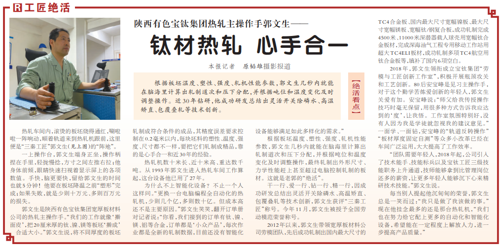 2018年,郭文生領(lǐng)銜成立寶鈦集團(tuán)“勞模與工匠創(chuàng)新工作室”,積極開(kāi)展瓶頸攻關(guān)和工藝創(chuàng)新。80后安寶峰是見(jiàn)習(xí)主操作手,對(duì)于這個(gè)勤學(xué)苦練愛(ài)創(chuàng)新的年輕人,郭文生關(guān)愛(ài)有加。安寶峰說(shuō):“師父給我傳授操作技巧時(shí)毫無(wú)保留,用很多種方式告訴我應(yīng)達(dá)到的‘度’,讓我悟。工作室氛圍特別好,沒(méi)有人因?yàn)槲沂菍W(xué)徒就忽視我的建議意見(jiàn)?!币幻鎸W(xué)、一面鉆,安寶峰的“軌道反轉(zhuǎn)操作”“板材厚度固定自測(cè)”等眾多小改革已經(jīng)在車(chē)間廣泛運(yùn)用,大大提高了工作效率。
