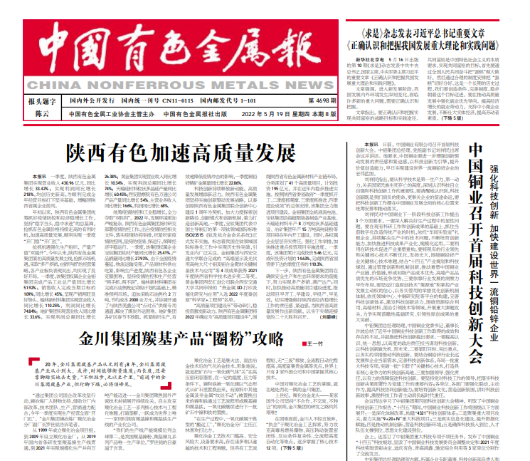 科技創(chuàng)新持續(xù)釋放新動能,高質(zhì)量發(fā)展增添新活力。陜西有色金屬集團(tuán)堅持實(shí)施創(chuàng)新驅(qū)動發(fā)展戰(zhàn)略,以秦創(chuàng)原陜西有色金屬集團(tuán)聯(lián)合創(chuàng)新中心建設(shè)1周年為契機(jī),加大力度探索創(chuàng)新路徑、創(chuàng)新模式和創(chuàng)新機(jī)制,著力打造創(chuàng)新高地。一季度,寶鈦集團(tuán)代表中國主導(dǎo)制訂的第一項(xiàng)鈦領(lǐng)域國際標(biāo)準(zhǔn)ISO23515《鈦及鈦合金命名系統(tǒng)》正式發(fā)布實(shí)施,標(biāo)志著我國在鈦領(lǐng)域國際標(biāo)準(zhǔn)化工作中實(shí)現(xiàn)歷史性突破,引發(fā)業(yè)內(nèi)廣泛關(guān)注。金鉬集團(tuán)與西安交通大學(xué)聯(lián)合完成的“高端顯示及光伏用高純大尺寸鉬及鉬合金靶材關(guān)鍵制備技術(shù)與應(yīng)用”等4項(xiàng)成果獲得2021年度陜西省科學(xué)技術(shù)進(jìn)步獎二等獎。黃金集團(tuán)西安匯創(chuàng)公司聯(lián)合西安交通大學(xué)共同申報的“貴金屬3D打印及催化研究與應(yīng)用”入選2022年度秦創(chuàng)原“科學(xué)家+工程師”名單。