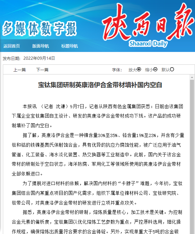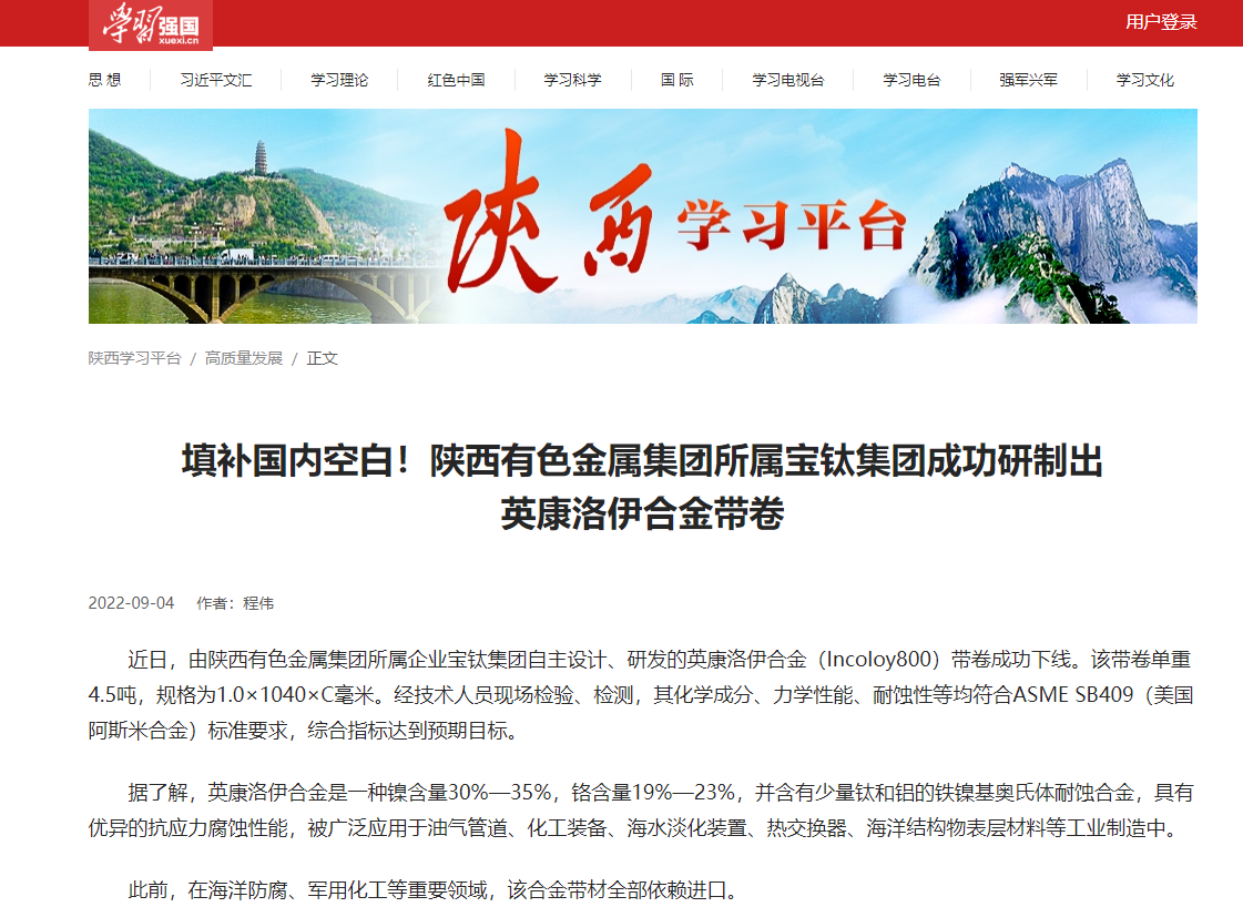 近日,由陜西有色金屬集團所屬企業(yè)寶鈦集團自主設(shè)計、研發(fā)的英康洛伊合金(Incoloy800)帶卷成功下線。該帶卷單重4.5噸,規(guī)格為1.0×1040×C毫米。經(jīng)技術(shù)人員現(xiàn)場檢驗、檢測,其化學(xué)成分、力學(xué)性能、耐蝕性等均符合ASME SB409(美國阿斯米合金)標(biāo)準(zhǔn)要求,綜合指標(biāo)達到預(yù)期目標(biāo)。
