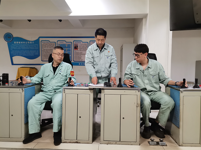 郭文生(中)指導(dǎo)徒弟進(jìn)行板材軋制。