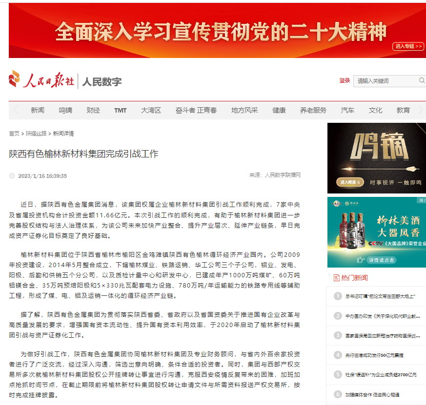據(jù)了解,陜西有色金屬集團(tuán)為貫徹落實(shí)陜西省委、省政府以及省國(guó)資委關(guān)于推進(jìn)國(guó)有企業(yè)改革與高質(zhì)量發(fā)展的要求,增強(qiáng)國(guó)有資本流動(dòng)性、提升國(guó)有資本利用效率,于2020年啟動(dòng)了榆林新材料集團(tuán)引進(jìn)戰(zhàn)略投資者與資產(chǎn)證券化工作。