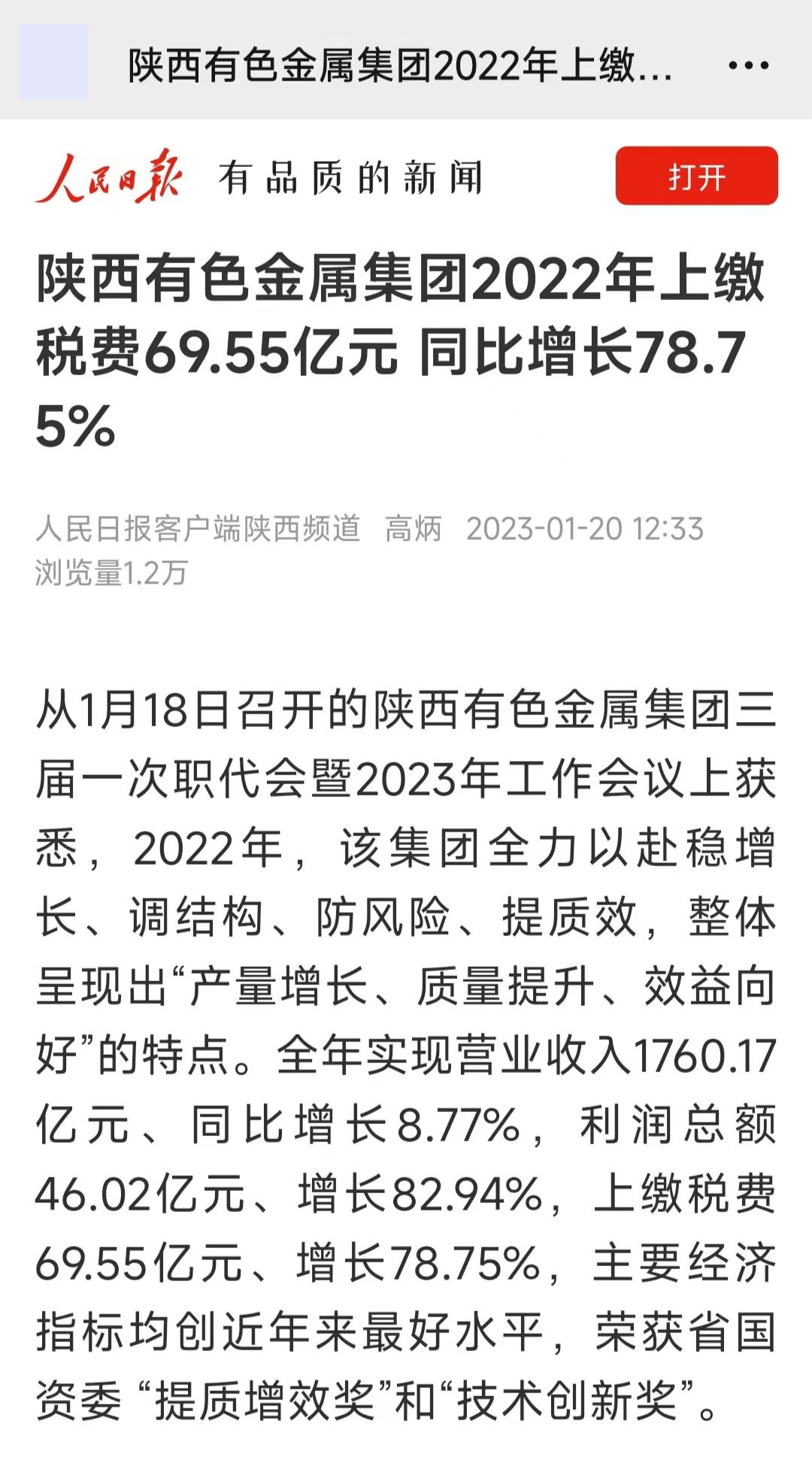 人民日?qǐng)?bào)、學(xué)習(xí)強(qiáng)國、華商報(bào)、三秦都市報(bào):陜西有色金屬集團(tuán)2022年上繳稅費(fèi)69.55億元 同比增長78.75%