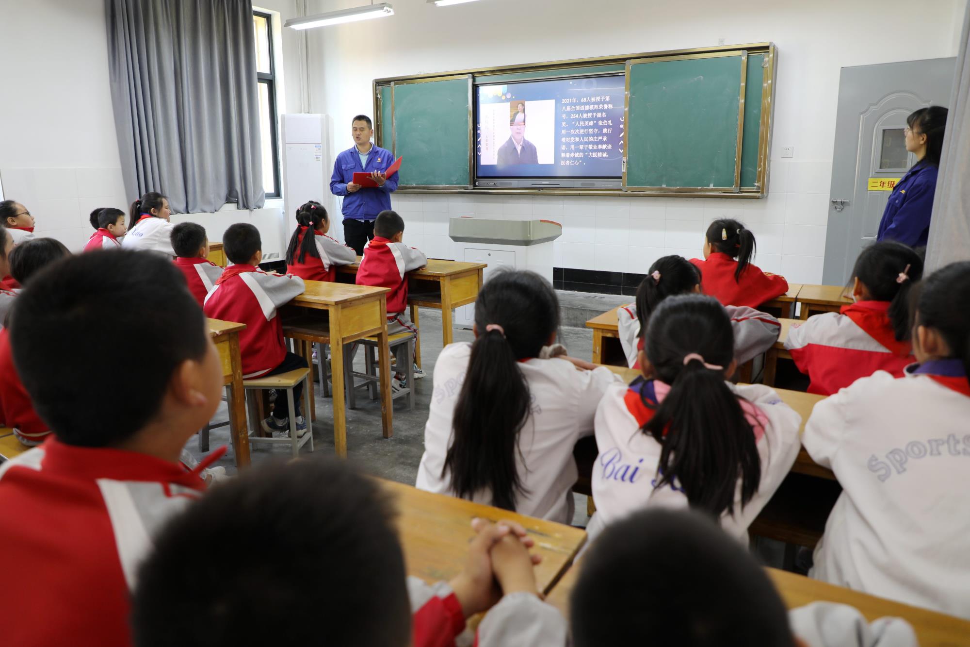 “大手拉小手 模范事跡進校園”活動過程中,志愿者們向小學生宣講“抗疫英雄”張伯禮、“時代楷?!睆埞鹈返氖论E,以榜樣力量助力少年兒童健康成長。共同唱響《歌唱祖國》,攜手變身“礦區(qū)文明小衛(wèi)士”…… 志愿者與孩子們約定,要做有“家國情懷”的人。