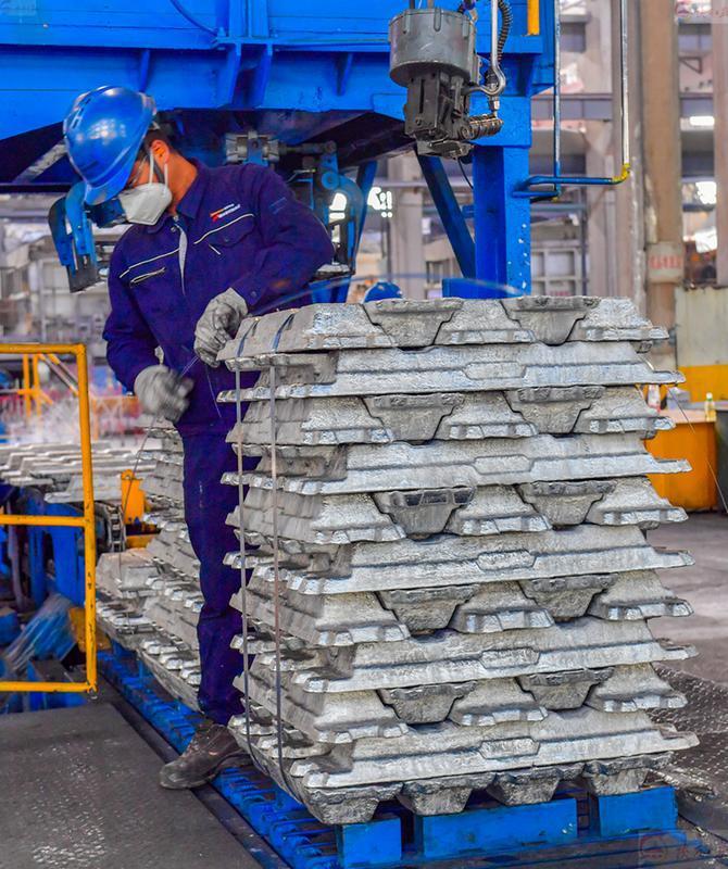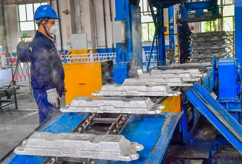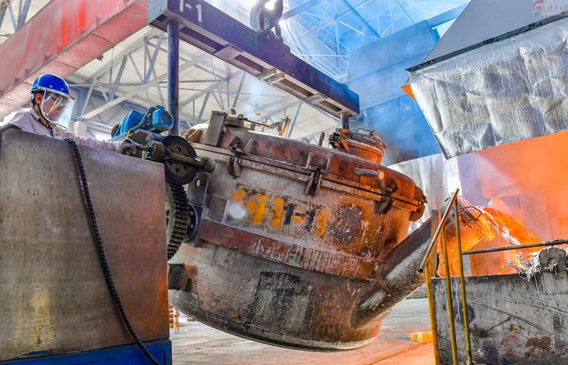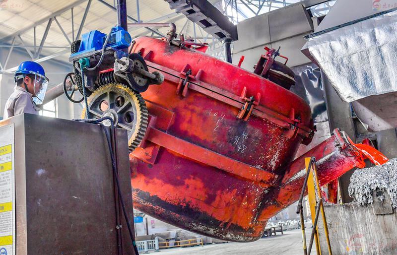 6月12日,在陜西有色榆林新材料集團(tuán)鑄造車(chē)間,工人正進(jìn)行入鋁作業(yè)。
