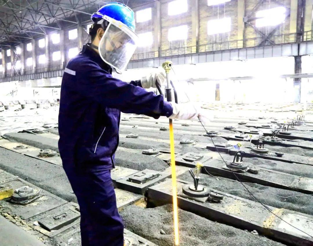 不管是早班還是晚班,我們這些熟練工基本都是滿負荷作業(yè),更不用說新人?!蓖鯊堈f。跟隨王彥龍走進車間,此時電解槽旁的溫度更是高達60℃以上。在一頓繁雜的操作后,王彥龍指揮天車將殘極提了起來,撈塊、扒沉淀……整個作業(yè)持續(xù)了30分鐘左右。