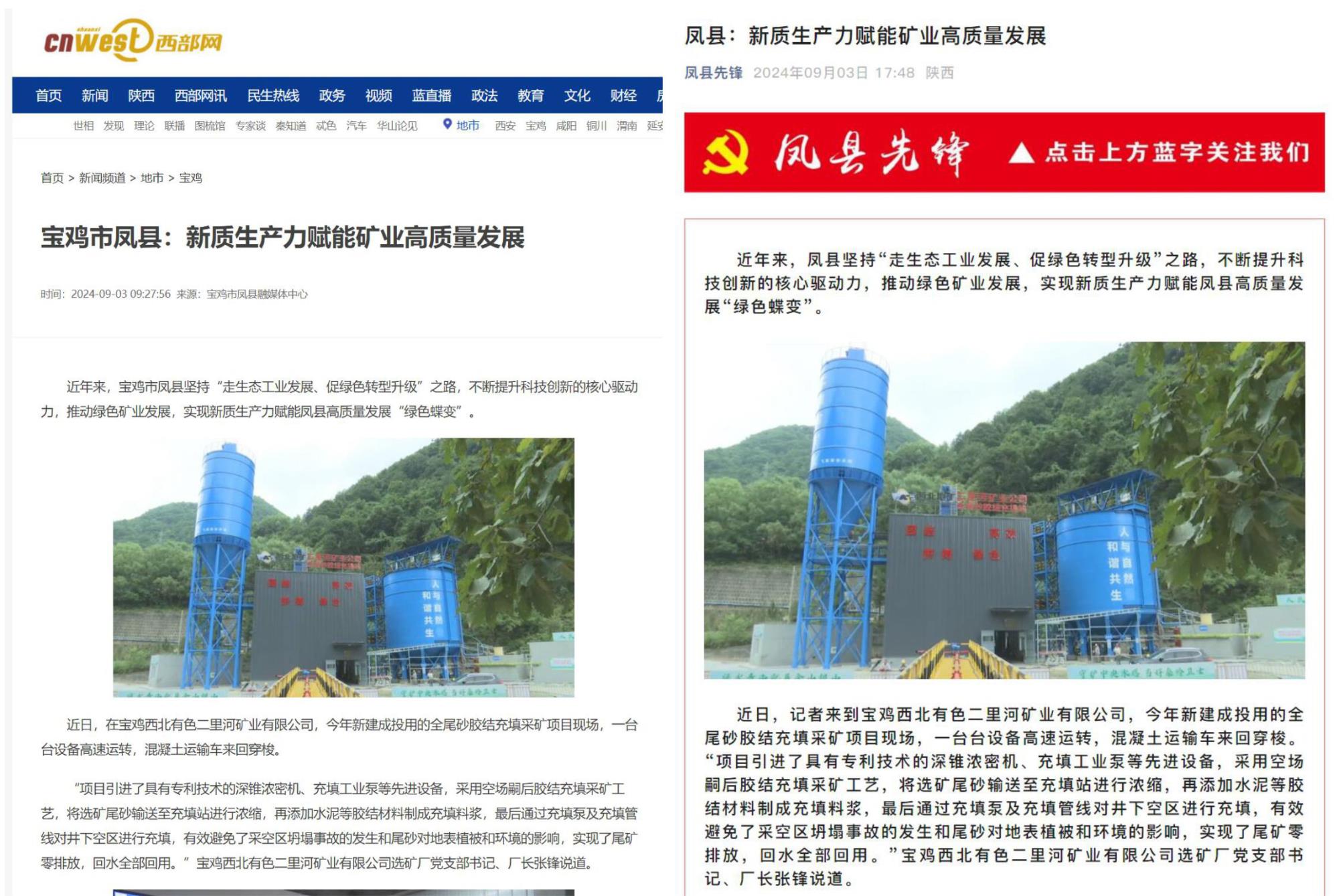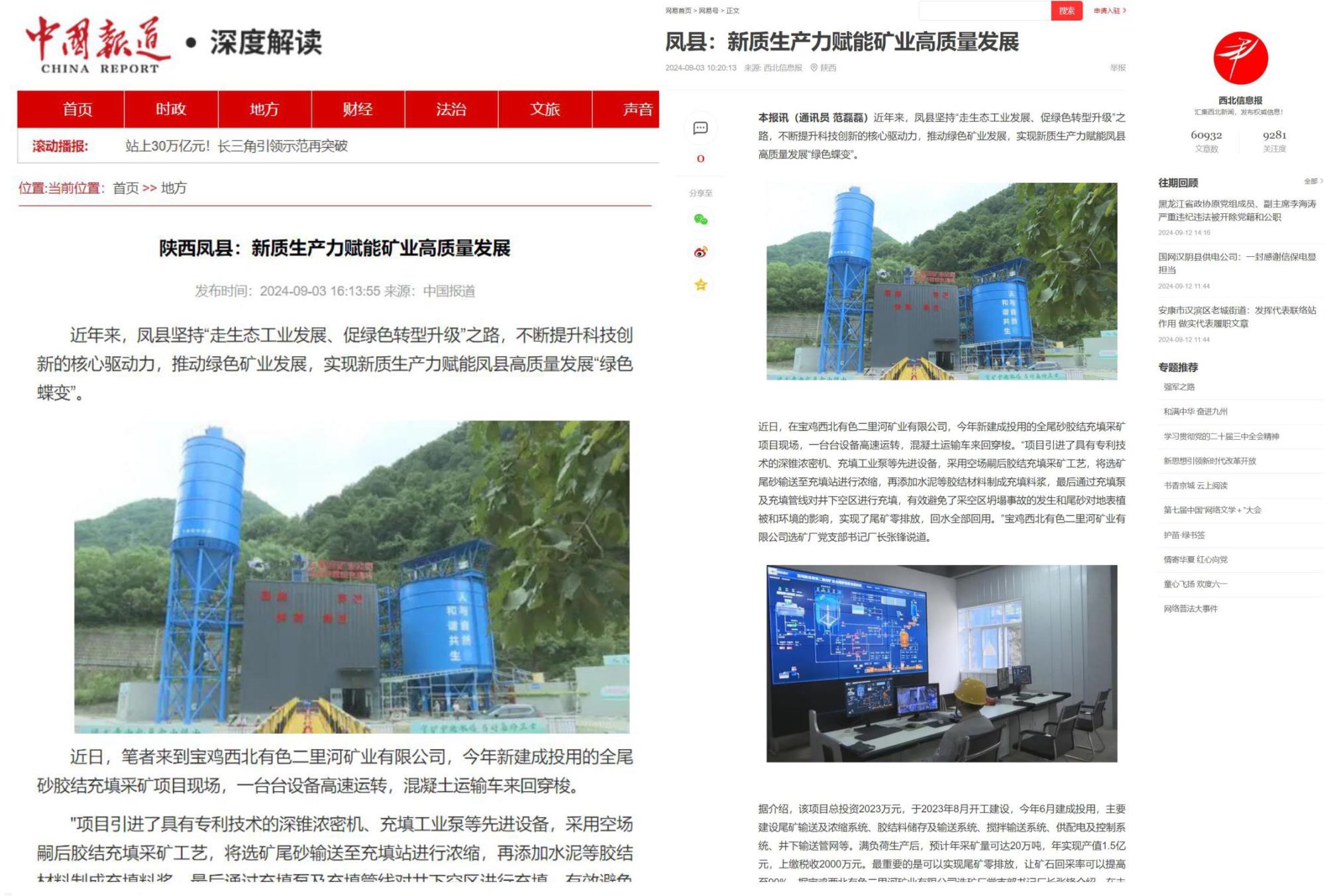 近日,中國報道、西部網(wǎng)、西北信息報、寶雞市鳳縣融媒體中心、鳳縣先鋒等主流媒體,以《鳳縣:新質(zhì)生產(chǎn)力賦能礦業(yè)高質(zhì)量發(fā)展》為題,集中報道了地礦集團(tuán)權(quán)屬鉛鋅集團(tuán)寶雞各礦山企業(yè)和銀母寺礦業(yè)公司以綠色發(fā)展促進(jìn)新質(zhì)生產(chǎn)力躍升、賦能鳳縣社會經(jīng)濟(jì)高質(zhì)量發(fā)展的經(jīng)驗做法。全文如下: