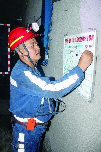 圖為:劉栓銀正在填寫通風(fēng)設(shè)施檢查記錄牌板