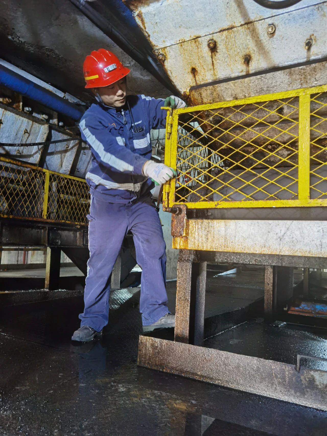 全穎哲正在檢修原煤倉(cāng)下給煤機(jī)護(hù)網(wǎng)