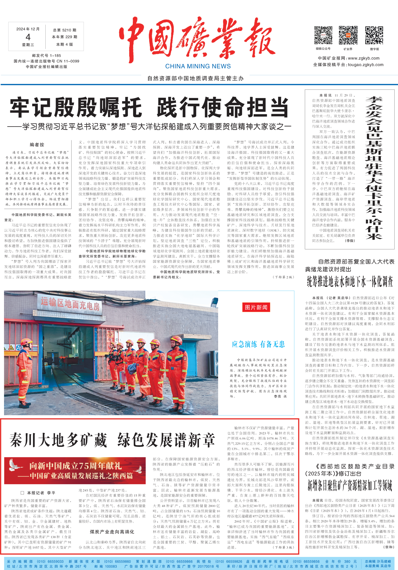 為慶祝新中國成立75周年華誕,中國礦業(yè)報社推出“中國礦業(yè)高質量發(fā)展巡禮”系列報道,12月4日,《中國礦業(yè)報》刊發(fā)陜西篇《秦川大地多礦藏 綠色發(fā)展譜新章》一文。文章從“煤炭產業(yè)走向高端化”“全面推進綠色礦山建設”“找礦為高質量發(fā)展護航”三個章節(jié)系統(tǒng)介紹了陜西省能源資源企業(yè)和地勘單位在保障國家能源資源安全方面發(fā)揮的“壓艙石”作用。其中,文章報道了地礦集團權屬鉛鋅集團鳳縣分公司、鉛硐山礦業(yè)公司、二里河礦業(yè)公司、山陽秦鼎礦業(yè)公司,以及黃金集團權屬四方金礦等多家礦山企業(yè)在全面推進綠色礦山建設,加快礦業(yè)綠色低碳轉型發(fā)展的工作成果,將“采礦不見礦,礦在綠中藏”的暢想變?yōu)楝F實。文章還介紹了地礦集團牢牢把握“聚焦主業(yè)、雙輪驅動、多業(yè)并舉、跨越發(fā)展”戰(zhàn)略,通過“立足秦嶺、跳出秦嶺”戰(zhàn)略舉措,加快勘探開發(fā)和資源增儲上產,扛起了保障國家能源資源安全的使命擔當。