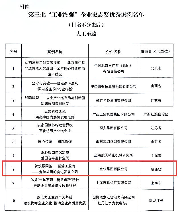 經(jīng)前期認真籌備,近日,寶鈦集團成功入選工信部工業(yè)文化發(fā)展中心第三批“工業(yè)圖強”企業(yè)史志鑒優(yōu)秀案例名單。