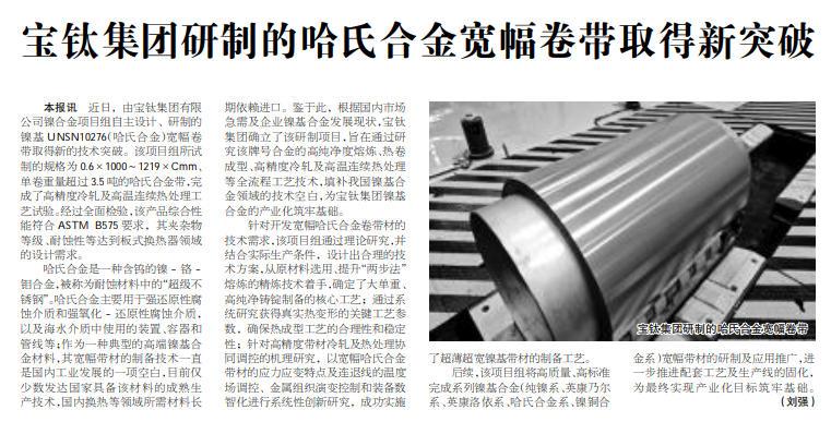 近日,由寶鈦集團(tuán)鎳合金項(xiàng)目組自主設(shè)計(jì)、研制的鎳基UNSN10276(哈氏合金)寬幅卷帶取得新的技術(shù)突破。他們所試制的規(guī)格為0.6×1000~1219×Cmm、單卷重量超過3.5噸的哈氏合金帶,完成了高精度冷軋及高溫連續(xù)熱處理工藝試驗(yàn)。經(jīng)過全面檢驗(yàn),產(chǎn)品綜合性能符合ASTM B575要求,其夾雜物等級(jí)、耐蝕性、冷深沖壓型等達(dá)到板式換熱器領(lǐng)域的設(shè)計(jì)需求。