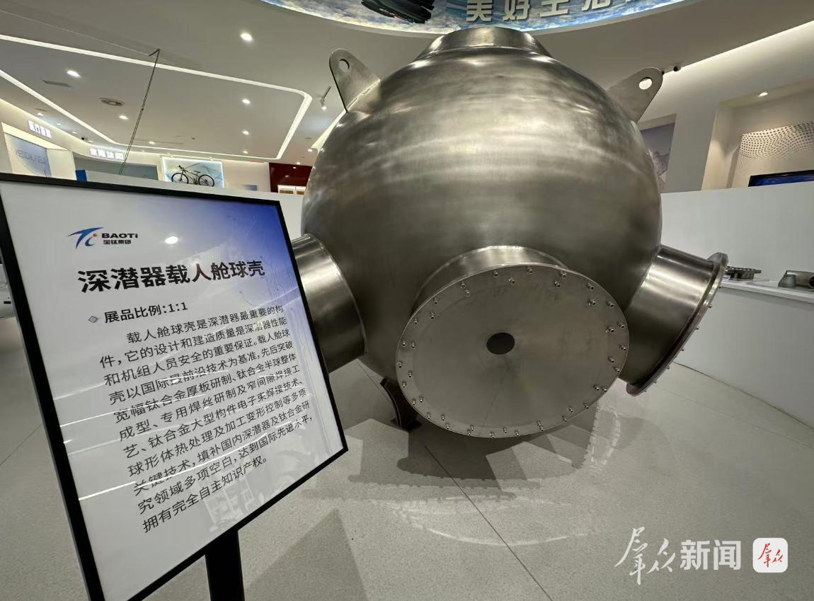 9月23日,走進(jìn)寶鈦集團(tuán),展覽館內(nèi)碩大的深潛器載人艙球殼模型將時間線拉回5年前。2020年11月,裝有寶鈦研制生產(chǎn)的鈦合金載人球艙的“奮斗號”載人潛水器在馬里亞納海溝成功坐底10909米,創(chuàng)造我國載人深潛的新紀(jì)錄。