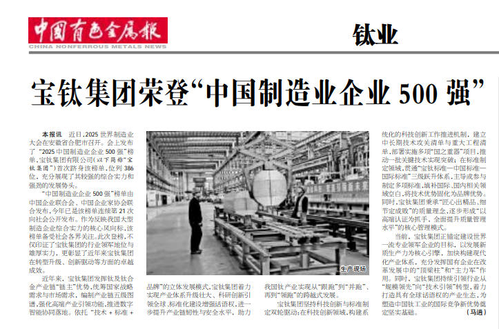 近日,2025世界制造業(yè)大會在安徽省合肥市召開。會上發(fā)布了“2025中國制造業(yè)企業(yè)500強”榜單,寶鈦集團有限公司(以下簡稱“寶鈦集團”)首次躋身該榜單,位列386位,充分展現(xiàn)了其較強的綜合實力和強勁的發(fā)展勢頭。