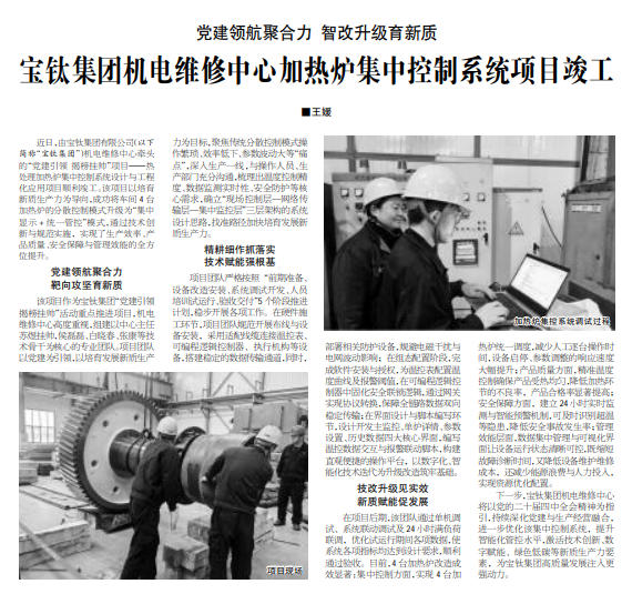 中國有色金屬報(bào):黨建領(lǐng)航聚合力 智改升級(jí)育新質(zhì) 寶鈦集團(tuán)機(jī)電維修中心加熱爐集中控制系統(tǒng)項(xiàng)目竣工