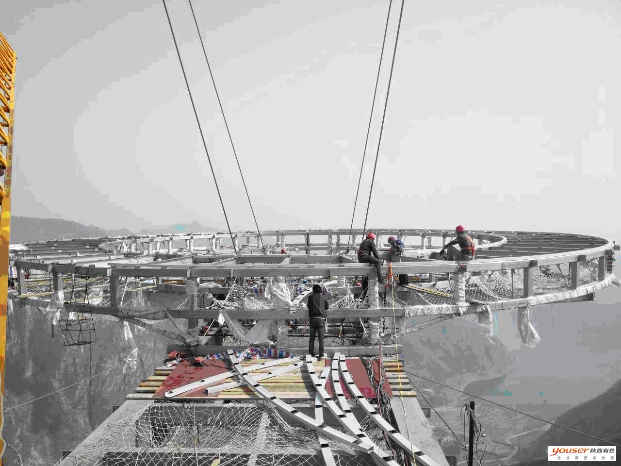 在制作成型并預(yù)組裝合適后,將鈦主體結(jié)構(gòu)分段成16塊,進(jìn)行每一塊重量計(jì)算,確保弦長(zhǎng)不超過(guò)11米,重量不超過(guò)3噸,為便于運(yùn)輸,在山底通過(guò)貨索分段運(yùn)輸?shù)缴巾?,最終在山頂上拼裝成一個(gè)整體。現(xiàn)場(chǎng)焊接安裝也是該公司負(fù)責(zé)。由8名員工進(jìn)行現(xiàn)場(chǎng)作業(yè)。焊接現(xiàn)場(chǎng)位于北京平谷區(qū)一座海拔786米的山頂,對(duì)焊工水平要求極高,在距崖底400米高空,工人走到焊接部位要從很窄的橫梁上通過(guò),對(duì)于恐高的人來(lái)說(shuō)障礙比較大。領(lǐng)隊(duì)李曉軍說(shuō):“由于山上早上風(fēng)小,為了能早點(diǎn)開(kāi)工,住在山腳下民房里的工人們每天清晨4點(diǎn)半就要出發(fā),要坐十幾分鐘的纜車(chē),還要爬半個(gè)小時(shí)山路才能到達(dá)施工現(xiàn)場(chǎng),等到山頂上天就亮了?,F(xiàn)場(chǎng)高空焊接條件艱苦,人只能坐到容納一個(gè)人的吊籃里,整個(gè)人懸掛到半空中作業(yè),山上風(fēng)大,吊籃隨風(fēng)擺動(dòng),里面的工人作業(yè)難度可想而知。焊接時(shí)如果有風(fēng)會(huì)產(chǎn)生氧化,焊接過(guò)程中必須無(wú)風(fēng)或者風(fēng)速很小,為了正常作業(yè)只有將吊籃外部用塑料布包起來(lái),里面的焊工經(jīng)常由于缺氧而頭暈。山頂紫外線(xiàn)強(qiáng),而且工作時(shí)沒(méi)有可以遮陰的地方,工人們頂著烈日,才幾天臉上就被曬爆了皮。為了搶工期,午飯只能在施工現(xiàn)場(chǎng)解決,泡面、饅頭和一份簡(jiǎn)單的菜吃完,下午技術(shù)人員和鉚工及其他焊縫焊接人員還要安排第二天的工作,一直到下午6點(diǎn)才能下山休息。公司員工不畏辛勞的精神確保了該項(xiàng)目的順利完工?!?BR> 觀(guān)景臺(tái)施工單位由北京龍安華誠(chéng)建筑設(shè)計(jì)有限公司和華誠(chéng)博遠(yuǎn)建筑工程有限公司承擔(dān)。兩個(gè)公司承擔(dān)過(guò)鳥(niǎo)巢、中央電視臺(tái)、北京國(guó)貿(mào)三期等超級(jí)工程的設(shè)計(jì)建設(shè),在距山底600多米高的懸崖上建造世界級(jí)玻璃觀(guān)景平臺(tái),大型結(jié)構(gòu)件的運(yùn)輸和安裝都是極大的挑戰(zhàn)。據(jù)石林峽旅游項(xiàng)目負(fù)責(zé)人介紹,截至目前,已經(jīng)有500多家旅行社及眾多游客預(yù)定了該體驗(yàn)項(xiàng)目,游客人數(shù)遠(yuǎn)遠(yuǎn)超過(guò)預(yù)期。