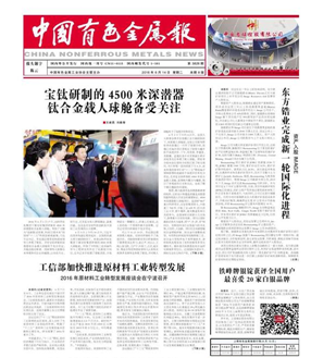 2016年6月1日~7日,由陜西有色集團(tuán)下屬寶鈦集團(tuán)研制的4500米深潛器鈦合金載人球艙,參加了主題為“創(chuàng)新驅(qū)動(dòng)發(fā)展、科技引領(lǐng)未來(lái)”的國(guó)家“十二五”科技創(chuàng)新成就展,習(xí)近平總書記、李克強(qiáng)總理等黨和國(guó)家領(lǐng)導(dǎo)人參觀了展覽,并對(duì)寶鈦研制的深潛器鈦合金載人球艙給予充分肯定,并提出殷切希望。國(guó)家領(lǐng)導(dǎo)人到展臺(tái)來(lái)參觀和對(duì)企業(yè)的勉勵(lì),讓有色行業(yè)、鈦行業(yè),尤其是寶鈦人群情激奮、備感自豪,這也是對(duì)寶鈦科技創(chuàng)新及中國(guó)鈦工業(yè)發(fā)展的巨大鼓舞。