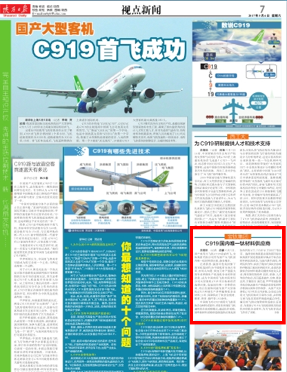 5月5日,國(guó)產(chǎn)商用大飛機(jī)C919成功首飛,寶鈦集團(tuán)有限公司作為國(guó)產(chǎn)大飛機(jī)國(guó)內(nèi)唯一鈦材料供應(yīng)商,備受矚目。