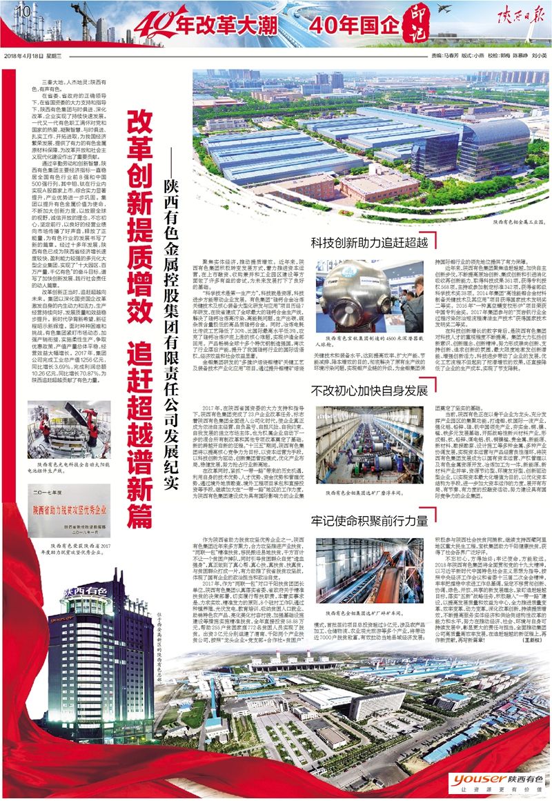 2017年,在陜西省國資委的大力支持和指導下,陜西有色集團完成了23戶企業(yè)改革任務(wù),標志著陜西有色集團全面進入公司化時代,使企業(yè)真正成為依法自主經(jīng)營、自負盈虧、自擔風險、自我約束、自我發(fā)展的獨立市場主體,也為權(quán)屬企業(yè)啟動下一步的混合所有制改革和其它專項改革奠定了基礎(chǔ)。新的跨越開啟新的征程。“十三五”期間,陜西有色集團將以提高核心競爭力為目標,以資本運營為手段,以科技創(chuàng)新為驅(qū)動,創(chuàng)新集團管控模式,優(yōu)化產(chǎn)業(yè)布局,穩(wěn)健發(fā)展,努力搶占行業(yè)新高地。