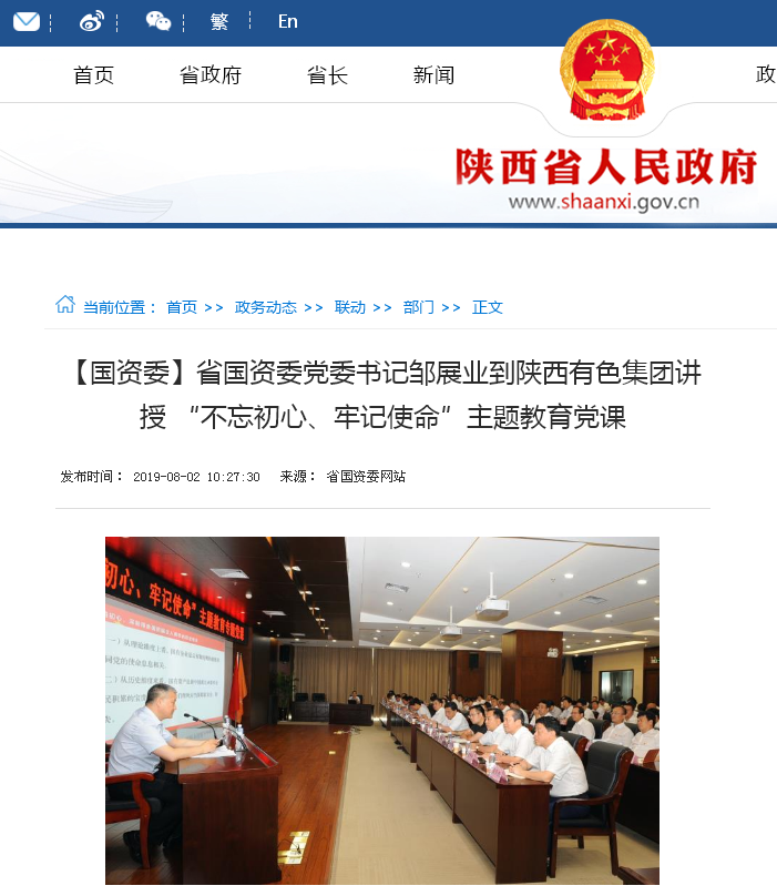 8月1日下午,根據(jù)中央、省委和省國(guó)資委黨委“不忘初心、牢記使命”主題教育部署,省國(guó)資委黨委書記鄒展業(yè)到陜西有色集團(tuán),以《悟初心、守初心、踐初心,以一流黨建推動(dòng)省屬企業(yè)高質(zhì)量發(fā)展》為題給黨員領(lǐng)導(dǎo)干部上了一堂內(nèi)涵深刻、生動(dòng)精彩的專題黨課。陜西有色集團(tuán)黨委書記、董事長(zhǎng)馬寶平主持黨課。