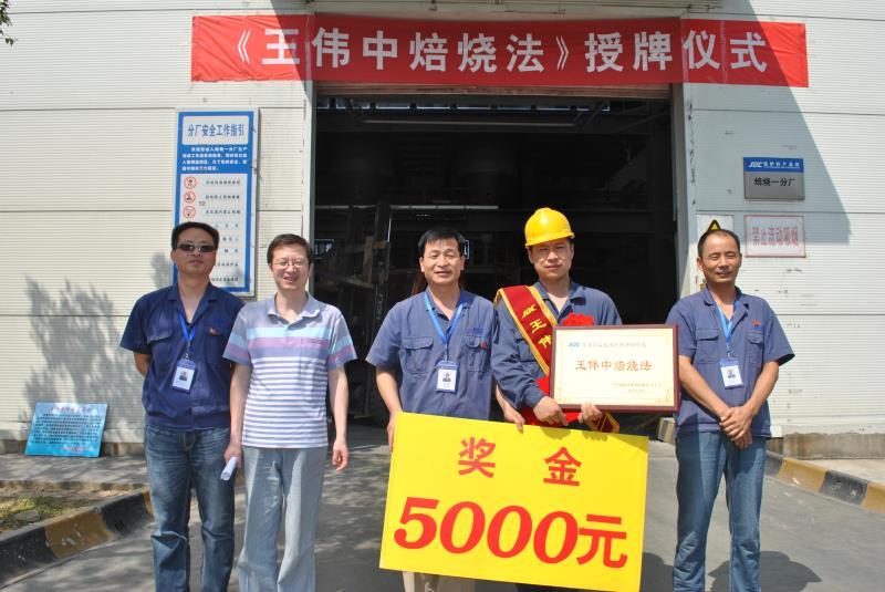 鉬爐料產品部引進并建成投產的氧化鉬多膛焙燒爐,因同時點燃各層所有燃燒器,導致爐內溫度過高,物料升華現(xiàn)象嚴重,結料較多,產品質量下降,天然氣損耗大。王偉中留心觀察,鉆研技術,發(fā)現(xiàn)焙燒爐料燒結結塊的根本原因在于溫度偏高,他創(chuàng)新性地采取了關閉部分爐層的燃燒器,調整進氣孔的開度大小,從而控制物料反應速度,使高溫爐層比原來降低40℃, 同時,利用物料自燃放熱,為焙燒提供熱量,有效遏制了焙燒過程中物料的燒結和升華,保證了產品質量,提高了金屬回收率,累計多回收金屬3噸,價值約30萬元,而且天然氣消耗顯著降低,節(jié)約了成本。通過低溫焙燒,在保證產品質量的同時,天然氣單耗由100多立方米降到50多立方米,不但比國內同類行業(yè)低,而且比國際同類行業(yè)還低1.6立方米,僅此一項,累計為企業(yè)節(jié)約成本1470萬元?!巴鮽ブ械蜏乇簾ā币惨虼嗽诮疸f集團首屆職工技術創(chuàng)新活動中獲得命名獎勵。
