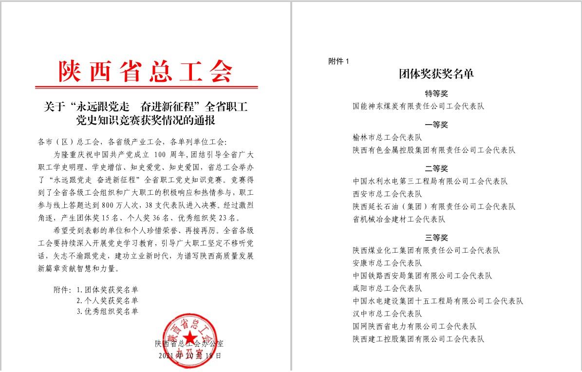 近日,陜西省總工會公布了永遠跟黨走 奮進新征程”全省職工黨史知識競賽決賽結(jié)果,集團公司代表隊榮獲團體一等獎。本次知識競賽共有38支參賽隊伍,114名選手參加。地礦集團、黃金集團3名選手代表集團公司參賽。