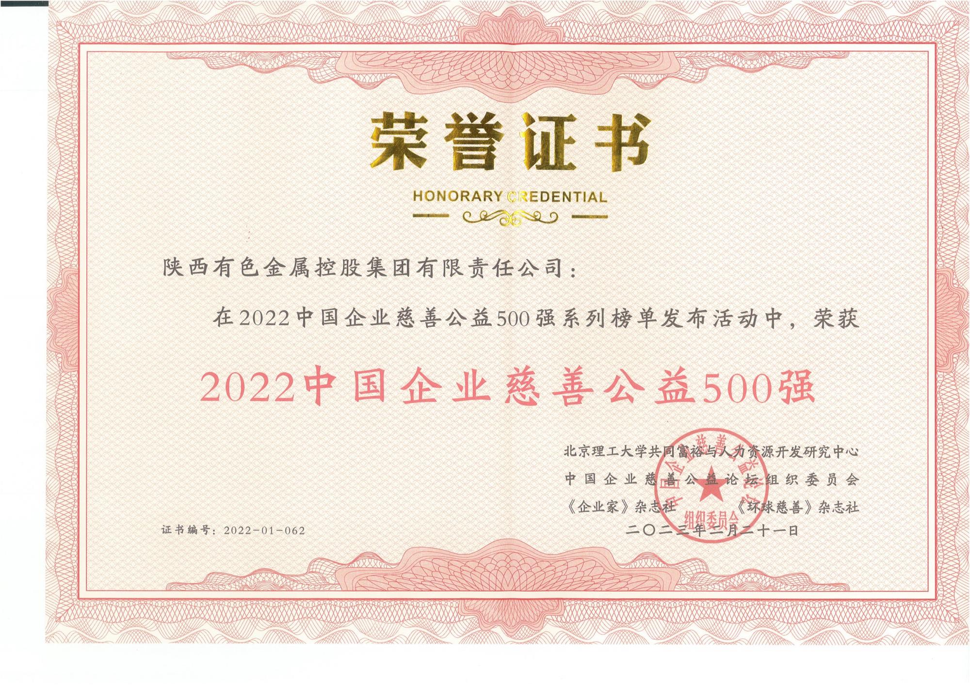 近日,2022中國(guó)企業(yè)慈善公益500強(qiáng)發(fā)布暨第六屆中國(guó)企業(yè)慈善公益論壇在重慶涪陵舉行,陜西有色金屬集團(tuán)榮獲“2022中國(guó)企業(yè)慈善公益500強(qiáng)”稱號(hào)。