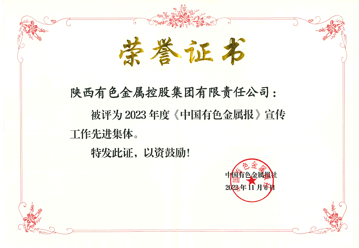 近日,陜西有色金屬集團(tuán)被中國(guó)有色金屬報(bào)社評(píng)為2023年度宣傳工作先進(jìn)集體。這是在前不久榮獲《中國(guó)有色金屬》雜志社宣傳工作先進(jìn)單位之后,該集團(tuán)在宣傳工作方面獲得的又一殊榮。