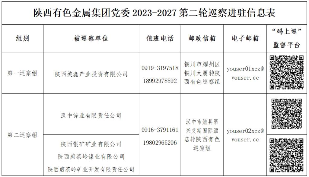 陜西有色金屬集團(tuán)黨委2023-2027第二輪巡察近日完成進(jìn)駐,根據(jù)集團(tuán)黨委統(tǒng)一部署,本輪巡察共派出2個(gè)巡察組,分別對陜西美鑫黨委、漢中鋅業(yè)黨委、陜西銀礦黨委、煎茶嶺鎳業(yè)黨委、煎茶嶺礦業(yè)黨支部開展常規(guī)巡察。