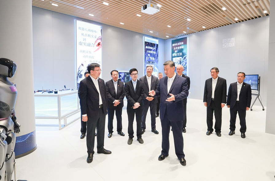 4月29日,中共中央總書記、國家主席、中央軍委主席習(xí)近平在上??疾?。這是習(xí)近平在位于徐匯區(qū)的上海“模速空間”大模型創(chuàng)新生態(tài)社區(qū)人工智能產(chǎn)品體驗店考察。新華社記者 謝環(huán)馳 攝