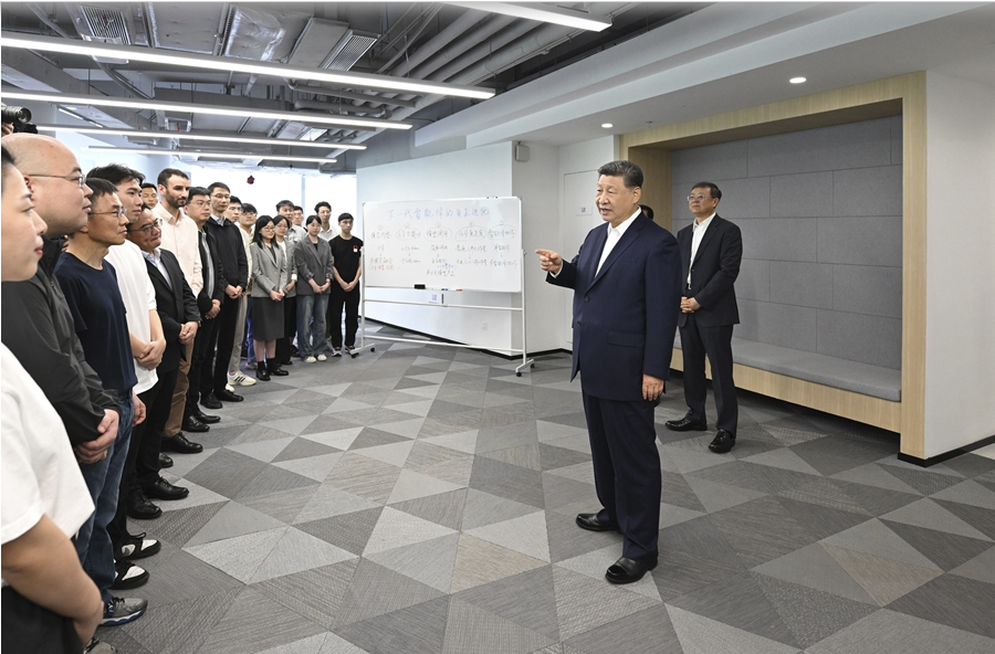 4月29日,中共中央總書記、國家主席、中央軍委主席習(xí)近平在上??疾?。這是習(xí)近平在位于徐匯區(qū)的上?!澳K倏臻g”大模型創(chuàng)新生態(tài)社區(qū),同正在參加“下一代智能體的自主進化”主題沙龍的青年創(chuàng)新人才親切交流。新華社記者 謝環(huán)馳 攝