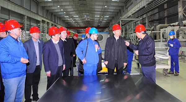 當(dāng)天下午,趙剛一行來(lái)到位于西安高新區(qū)錦業(yè)一路的鉬金屬工業(yè)園,現(xiàn)場(chǎng)參觀考察鉬產(chǎn)業(yè)發(fā)展,與集團(tuán)公司領(lǐng)導(dǎo)班子進(jìn)行座談。在馬寶平、鄒武裝、程方方,金鉬股份總經(jīng)理?xiàng)顕?guó)平等人陪同下,趙剛首先參觀了公司鉬產(chǎn)業(yè)布局示意沙盤,走進(jìn)金鉬股份展廳,聽(tīng)取了馬寶平對(duì)公司概況、主要產(chǎn)品、發(fā)展成就介紹。隨后,他深入鉬粉分廠和板材事業(yè)部,仔細(xì)參觀、詢問(wèn)了氧化鉬、鉬爐料及鉬板坯等鉬制品生產(chǎn)線的工藝流程、產(chǎn)品應(yīng)用等情況,對(duì)公司在我國(guó)鉬行業(yè)取得的領(lǐng)先地位和作出的突出貢獻(xiàn)表示贊賞。