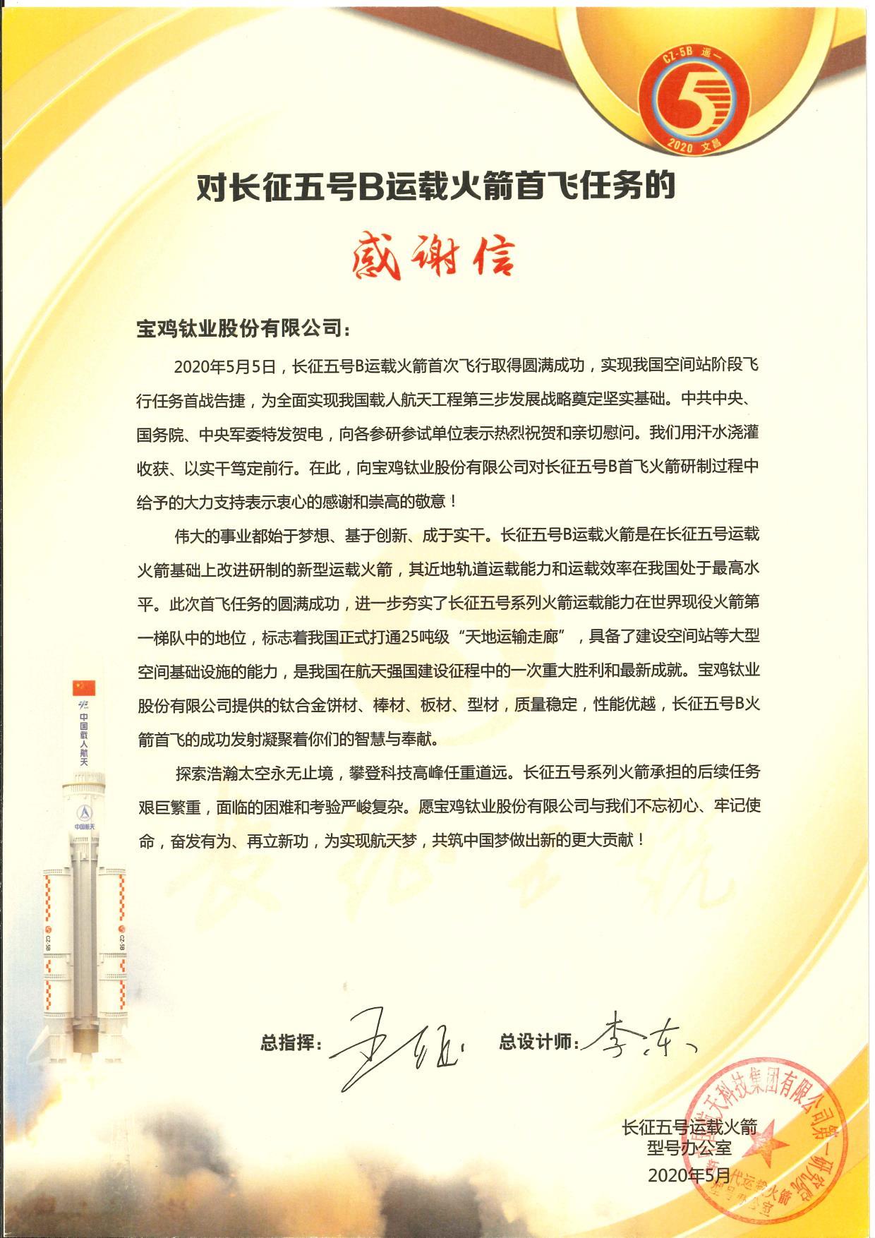 近日,寶鈦股份收到長征五號B運載火箭首飛任務(wù)的感謝信。寶鈦股份為長征五號B運載火箭提供的鈦合金餅材、棒材、板材、型材,質(zhì)量穩(wěn)定,性能優(yōu)越,受到客戶極大的肯定。
