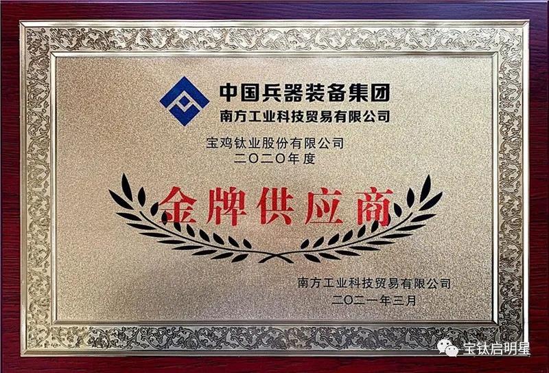 近日,寶鈦股份喜獲中國兵器裝備集團南方工業(yè)科技貿(mào)易有限公司2020年度“金牌供應(yīng)商”稱號。