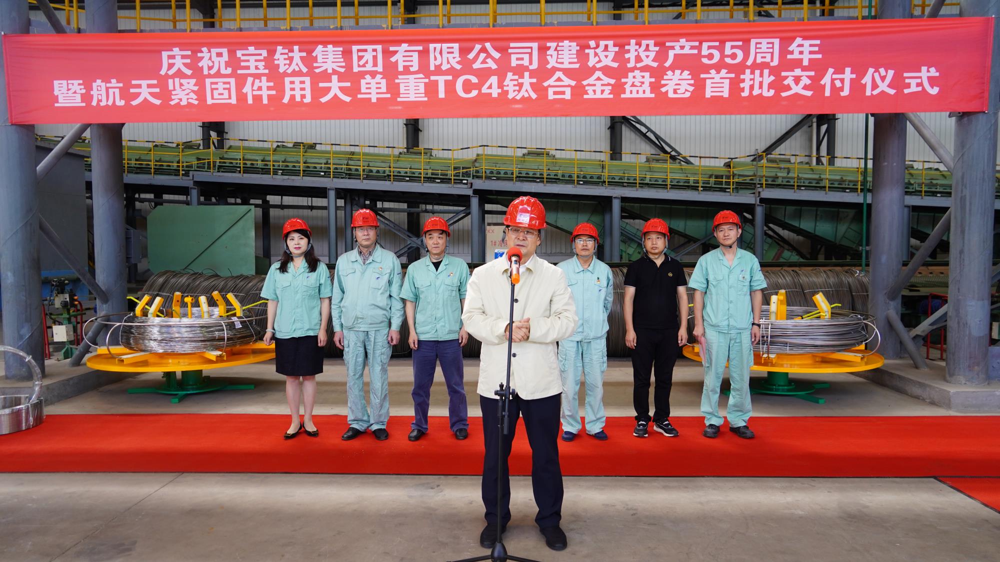 近日,寶鈦集團線材廠在熱軋生產(chǎn)線舉辦航天緊固件用大單重TC4鈦合金盤卷首批交付儀式,向集團建設(shè)投產(chǎn)55周年獻禮。寶鈦股份總經(jīng)理賈栓孝,副總經(jīng)理張延生、王鼎春,質(zhì)量部、軍品部、研究院等相關(guān)部門負責人,線材廠有關(guān)人員參加交付儀式。