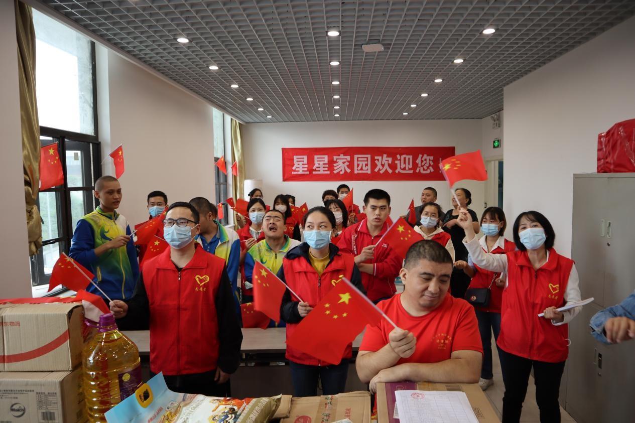 星星殘疾人陽光家園吸收了不同年齡、不同類別的智障弱能自閉青少年。志愿者服務(wù)隊(duì)參觀了孩子們的學(xué)習(xí)生活住所,代表地礦集團(tuán)研究院公司向星星家園捐贈(zèng)了文具、食品、玩具等生活和學(xué)習(xí)用品,并與孩子們進(jìn)行深入交流,傾聽每一名孩子的成長小故事。大家還共同攜手合唱了《我和我的祖國》《聽我說謝謝你》等歌曲。嘹亮的歌聲、揮舞的國旗、燦爛的笑容,和諧而溫馨的場景使在場的每個(gè)人為之動(dòng)容。