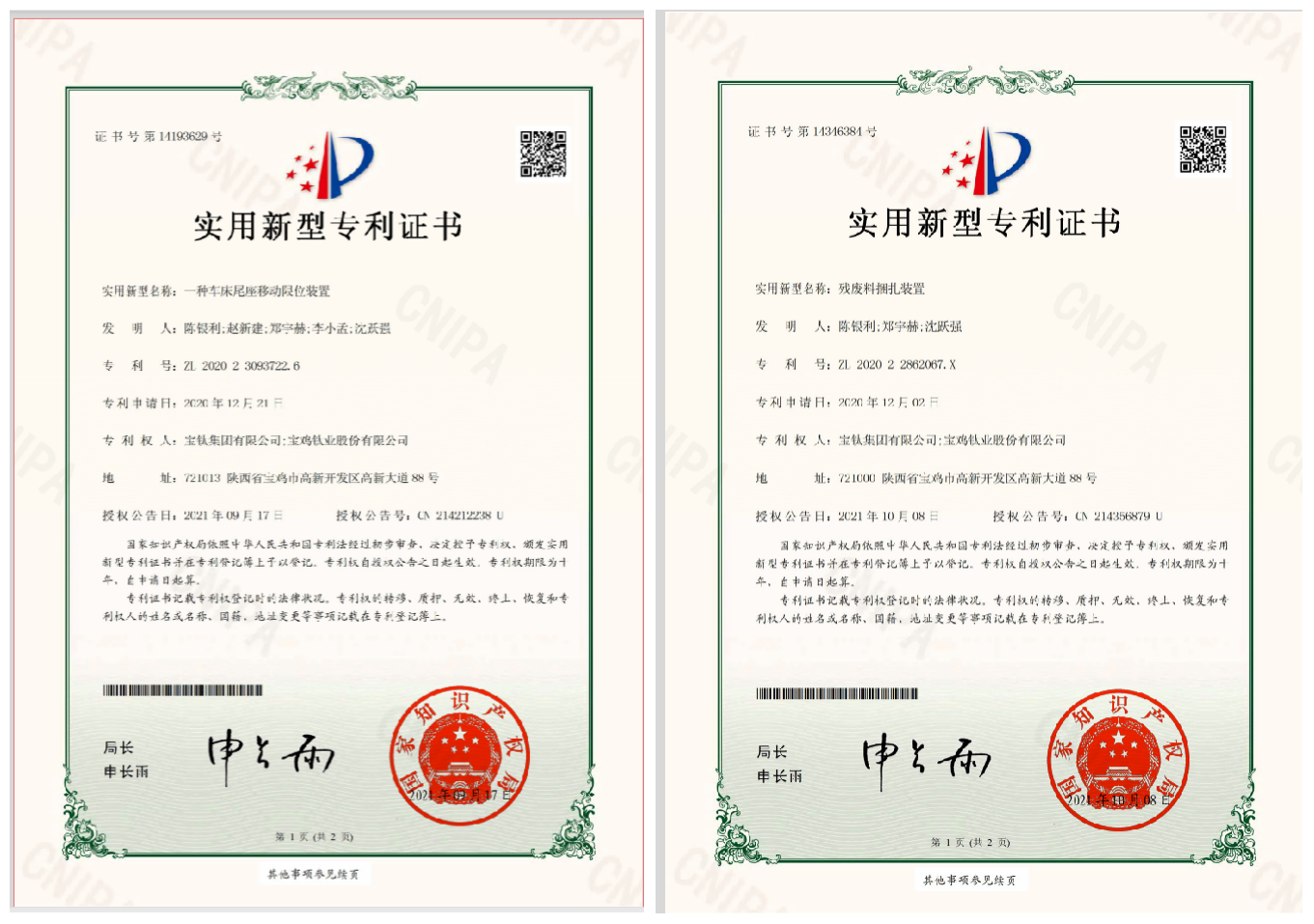 近日,寶鈦集團原料廠自主研發(fā)的《殘廢料捆扎裝置》和《一種車床尾座移動限位裝置》研究改造成果成功獲得國家實用新型專利的授權(quán),并取得專利證書。