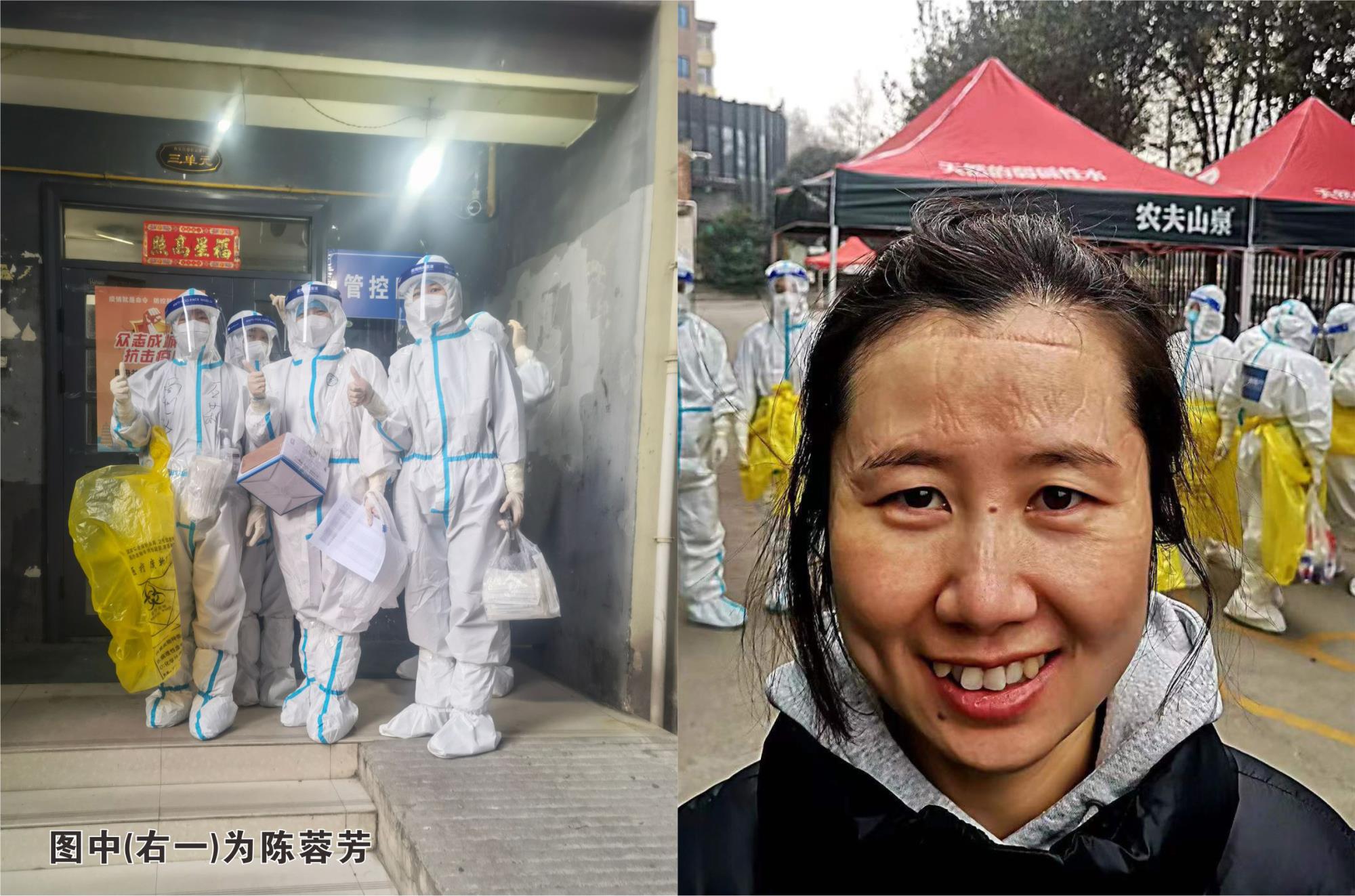參與社區(qū)防疫工作,難免要跟病毒“面對(duì)面”、“掰手腕”。廣交社區(qū)日?qǐng)?bào)社小區(qū)有1名確診病例,是重點(diǎn)封控小區(qū)。兩集團(tuán)規(guī)劃發(fā)展部下沉干部陳蓉芳主動(dòng)請(qǐng)戰(zhàn),負(fù)責(zé)確診樓的核酸掃碼工作。她坦言,第一次近距離和密接人員接觸,難免需要一些勇氣,但能和其他醫(yī)護(hù)人員一起去戰(zhàn)斗,又感到非常驕傲。在層層防護(hù)服的包裹下,每次持續(xù)工作5到6個(gè)小時(shí)、爬16層樓,頭痛、目眩、潮熱、呼吸困難是常有的事。摘掉面罩和口罩,滿臉的壓痕擋不住美麗的微笑?!芭旅矗俊彼脤?shí)際行動(dòng)給出了答案。