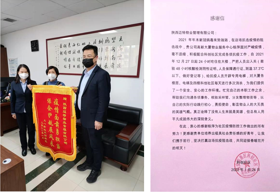 近日,西安高新區(qū)丈八街道科創(chuàng)社區(qū)黨支部書記、主任李華將寫有“抗疫面前勇?lián)?保企護航展風(fēng)采”的錦旗交到陜西邁特物業(yè)管理有限公司副總經(jīng)理譚志剛手中,并向在疫情期間積極配合社區(qū)完成各項工作的楊萍表達感謝。