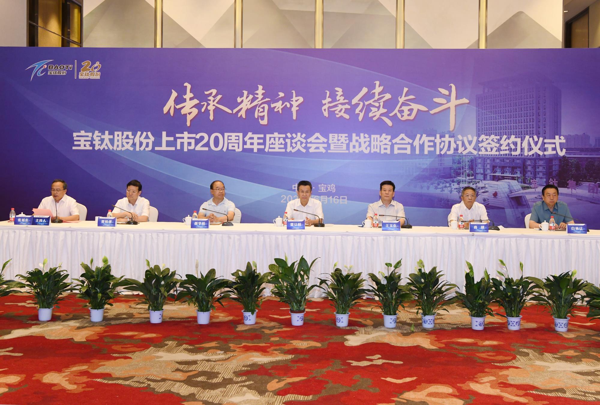 風(fēng)雨征程二十載,砥礪奮進(jìn)譜新篇。6月16日,寶鈦股份在寶雞海棠假日酒店舉行上市20周年座談會(huì)暨戰(zhàn)略合作協(xié)議簽約儀式,回顧發(fā)展歷程,展望美好前景,為加快建成世界鈦業(yè)強(qiáng)企凝聚強(qiáng)大合力。