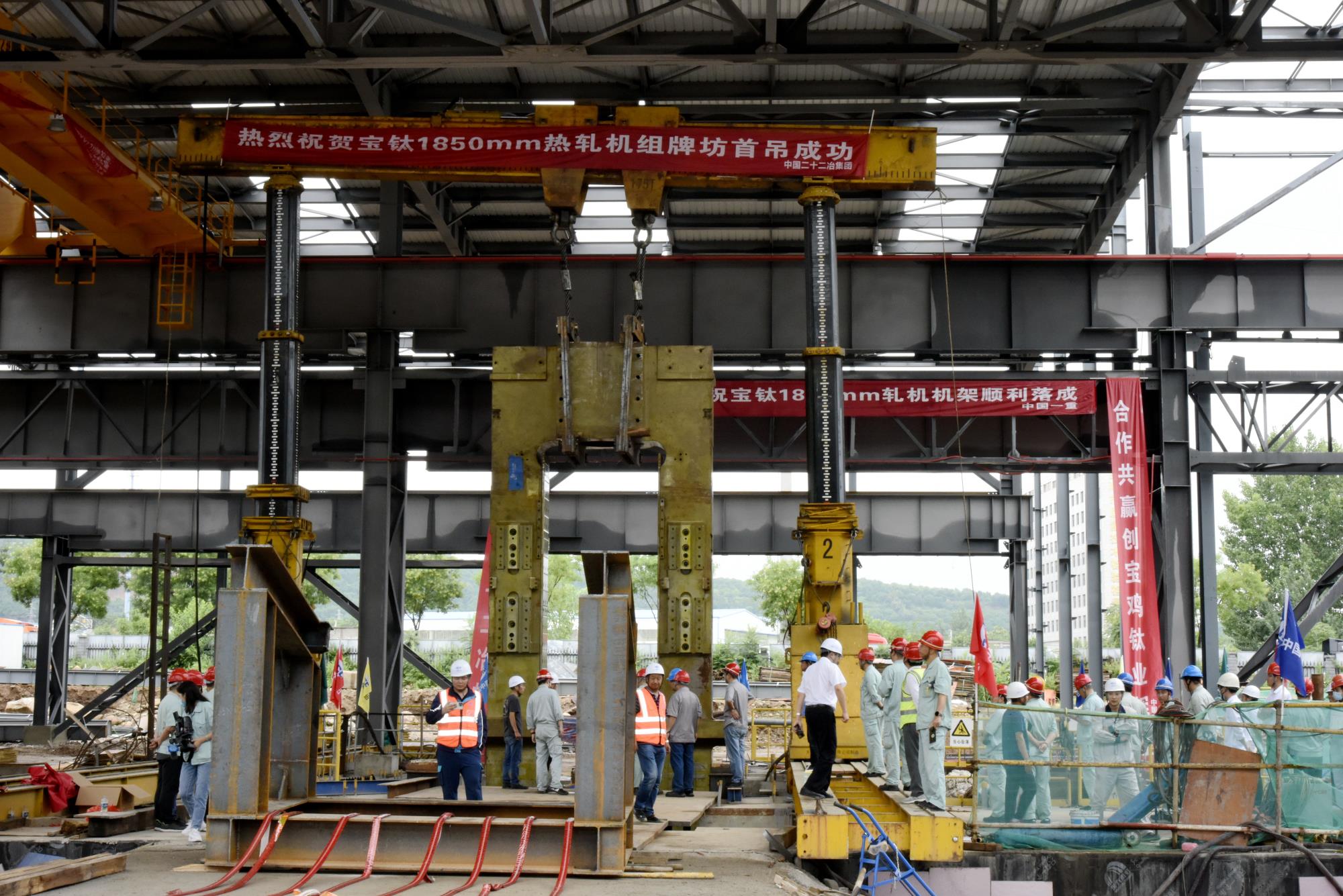 歷經(jīng)半年多時(shí)間的建設(shè),7月13日,寶鈦集團(tuán)宇航級(jí)寬幅鈦合金板材生產(chǎn)線建設(shè)項(xiàng)目核心設(shè)備1850mm熱軋機(jī)組順利完成了首片牌坊的吊裝就位作業(yè),標(biāo)志著該項(xiàng)目已全面進(jìn)入設(shè)備安裝階段。公司副總經(jīng)理王儉及相關(guān)部門負(fù)責(zé)人、施工單位負(fù)責(zé)人參加吊裝儀式。