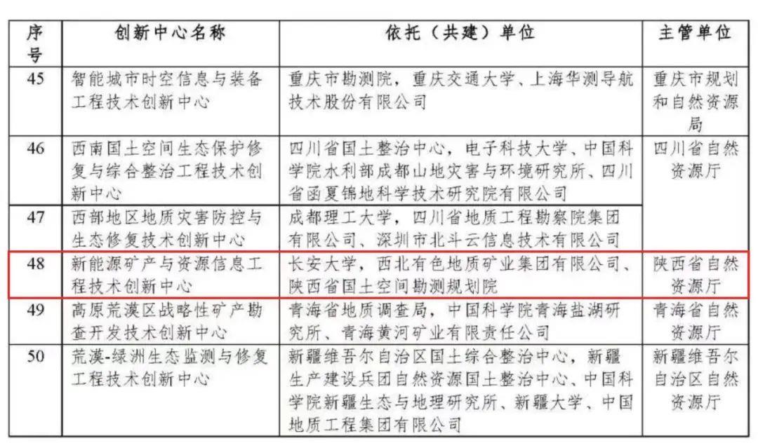 據(jù)悉,本次全國(guó)有50家工程技術(shù)創(chuàng)新中心獲得批復(fù),“新能源礦產(chǎn)與資源信息工程技術(shù)創(chuàng)新中心”是陜西省唯一一家獲得批復(fù)的創(chuàng)新中心,也是陜西省自然資源系統(tǒng)第二家部級(jí)工程技術(shù)創(chuàng)新中心。