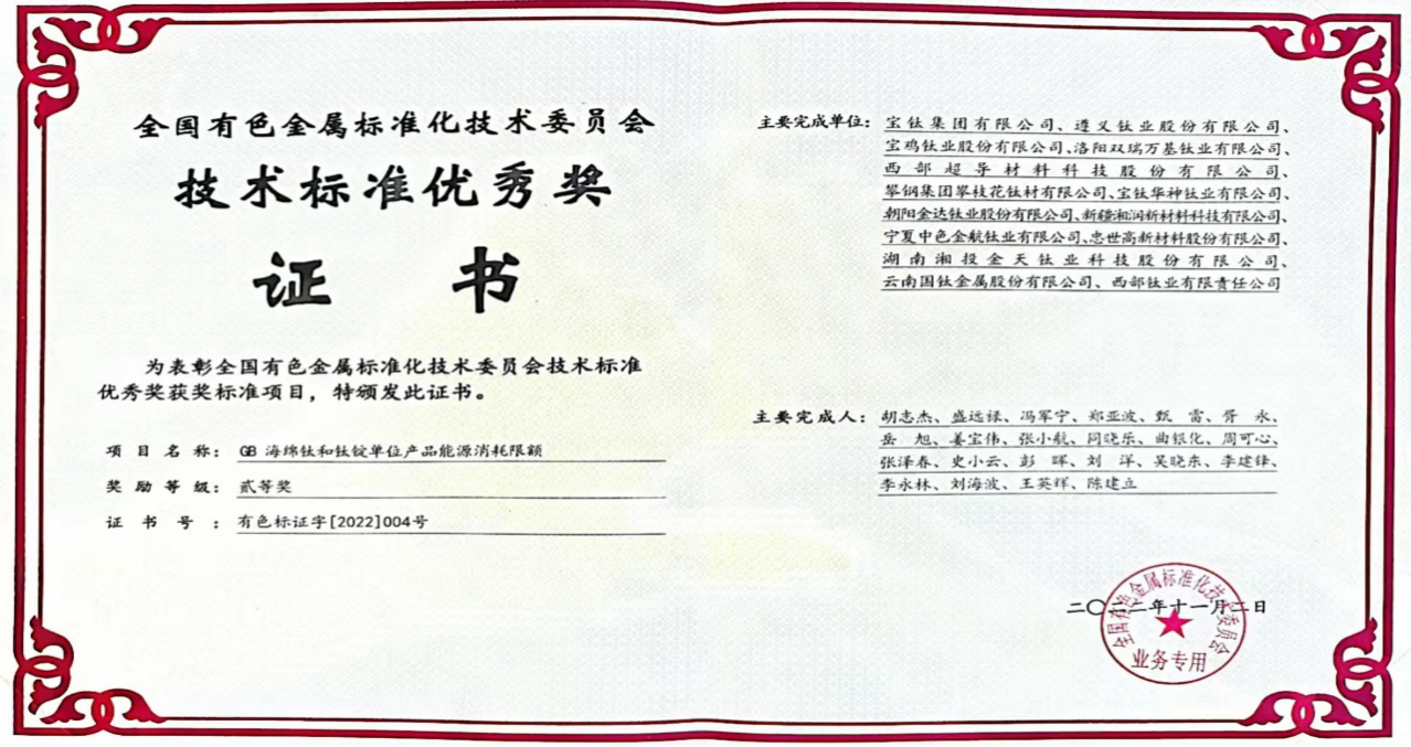 近日,2022年度全國有色金屬標(biāo)準(zhǔn)化技術(shù)委員會年會發(fā)布了全國有色金屬領(lǐng)域技術(shù)標(biāo)準(zhǔn)獲獎名單。由寶鈦集團(tuán)主持制定的強(qiáng)制性國家標(biāo)準(zhǔn)《海綿鈦和鈦錠單位產(chǎn)品能源消耗限額》榮獲“全國有色金屬標(biāo)準(zhǔn)化技術(shù)委員會技術(shù)標(biāo)準(zhǔn)優(yōu)秀獎”。