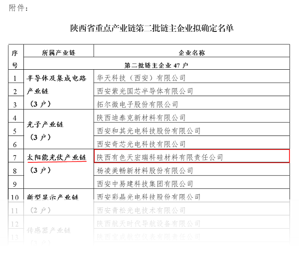 2023年6月6日,陜西省工業(yè)和信息化廳對(duì)陜西省重點(diǎn)產(chǎn)業(yè)鏈第二批鏈主企業(yè)擬確定名單進(jìn)行了公示,陜西有色天宏瑞科硅材料有限責(zé)任公司成功入選太陽(yáng)能光伏產(chǎn)業(yè)鏈鏈主企業(yè)。