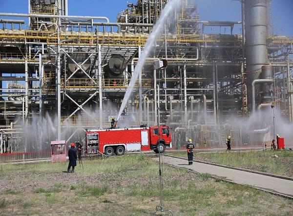 上午9時(shí)30分,演練正式開始。本次綜合應(yīng)急演練由公司黨委副書記、總經(jīng)理蘇旭盛擔(dān)任總指揮,副總經(jīng)理徐巖擔(dān)任現(xiàn)場(chǎng)指揮長(zhǎng)。主要模擬硅烷10區(qū)精餾單元DCS塔出料管線第一道氣動(dòng)控制閥下法蘭泄漏著火,現(xiàn)場(chǎng)1名巡檢人員被氯硅烷噴濺灼傷,氯硅烷水解后產(chǎn)生的酸性氣體擴(kuò)散至廠區(qū)西北側(cè)道路。公司立即啟動(dòng)《生產(chǎn)安全事故應(yīng)急救援預(yù)案》《突發(fā)環(huán)境事件應(yīng)急預(yù)案》,向榆林經(jīng)濟(jì)技術(shù)開發(fā)區(qū)管委會(huì)、佳縣應(yīng)急管理局、榆林市生態(tài)環(huán)境局佳縣分局上報(bào)事故及應(yīng)急處置情況,通過119指揮平臺(tái)報(bào)告火警,請(qǐng)求應(yīng)急支援,并向陜西有色金屬集團(tuán)報(bào)告。經(jīng)各應(yīng)急救援力量協(xié)同處置,對(duì)泄漏部位進(jìn)行緊急隔離,滅火及噴霧稀釋,條件具備后手動(dòng)關(guān)閉現(xiàn)場(chǎng)閥門,氯硅烷泄漏點(diǎn)消除,受傷人員得到及時(shí)救治,事故廢水全部在消防廢水池未外溢、周邊大氣污染物檢測(cè)指標(biāo)恢復(fù)正常,險(xiǎn)情解除,發(fā)布輿情信息。