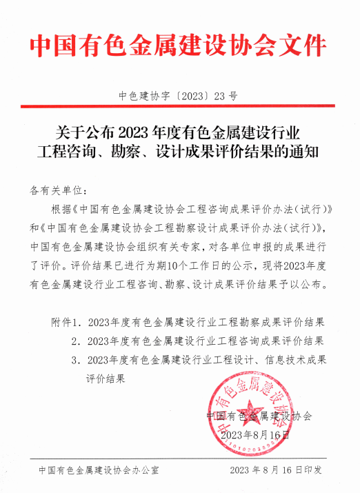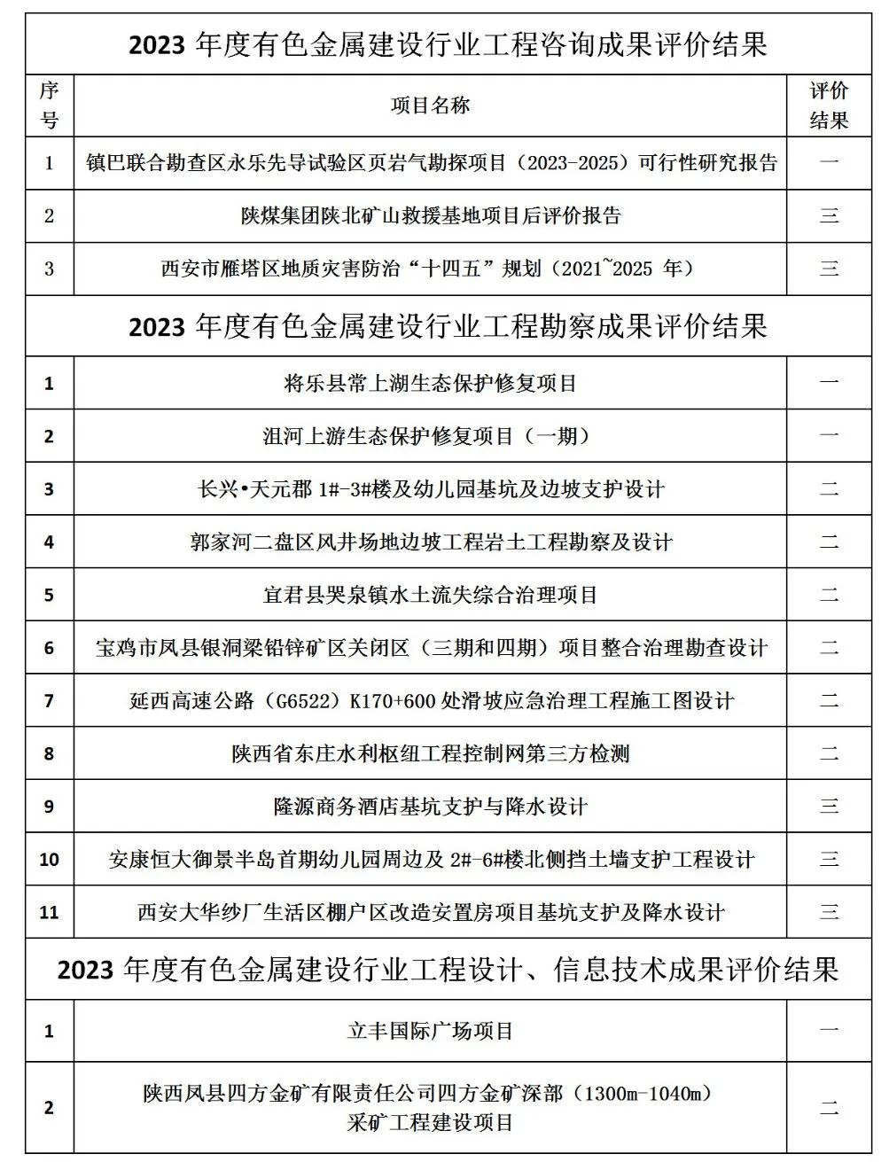 近日,2023年度有色金屬建設(shè)行業(yè)工程咨詢、勘察、設(shè)計成果評價結(jié)果揭曉,西安勘察設(shè)計院16項成果獲獎,其中一等獎4項,二等獎7項,三等獎5項。