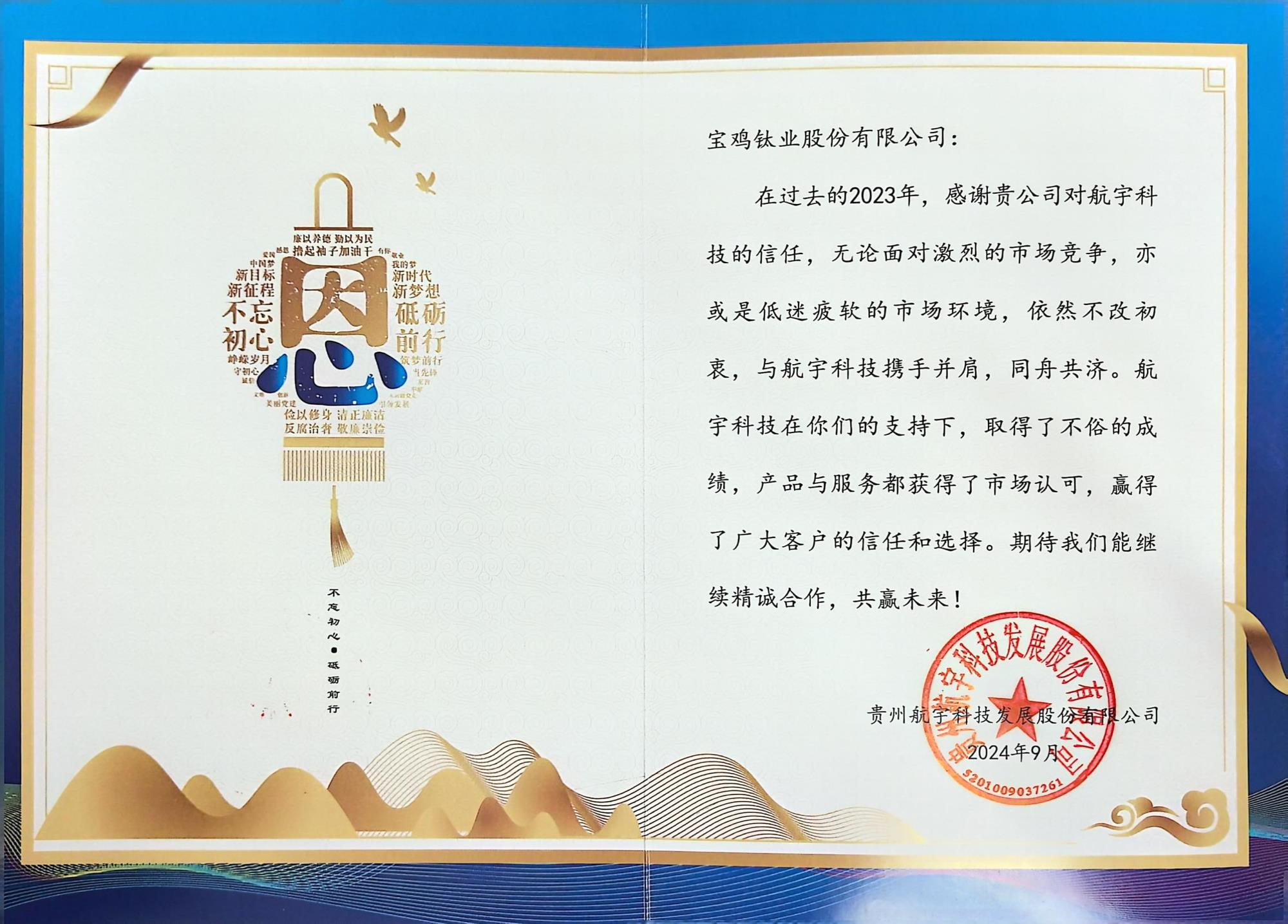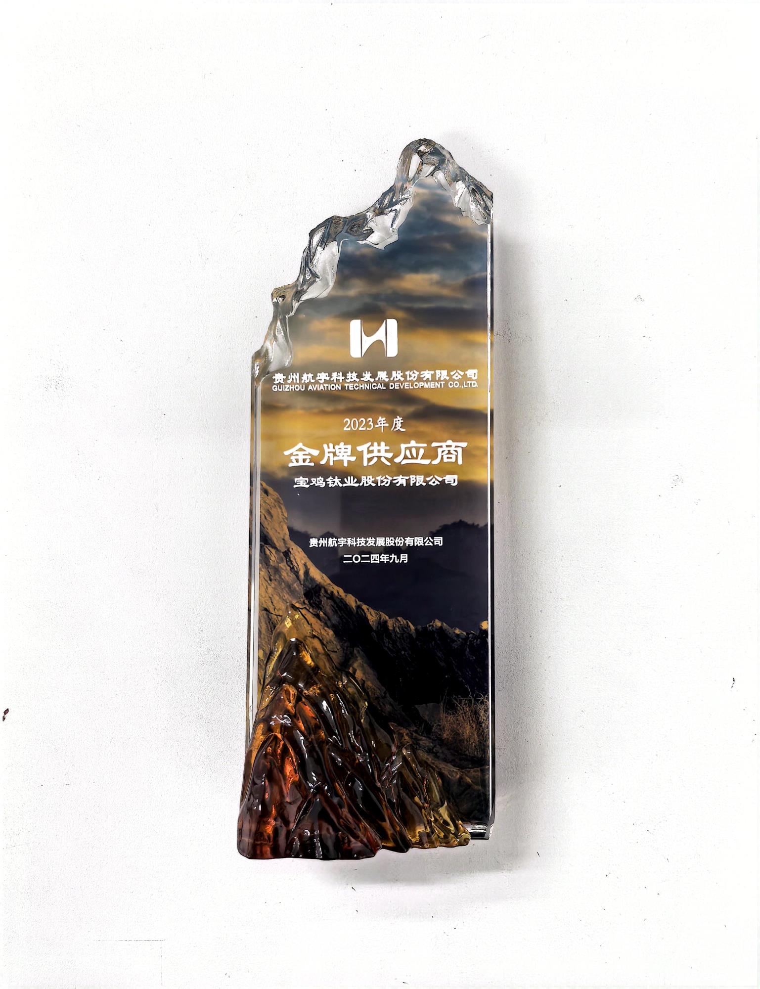 貴州航宇是我國大型航空航天環(huán)鍛件重點生產(chǎn)制造企業(yè),為我國多型航空、航天發(fā)動機進行環(huán)鍛件配套生產(chǎn),是寶鈦股份重點核心用戶之一。2023年,面對激烈的市場競爭,寶鈦股份在產(chǎn)品技術質量要求不斷提高、交付壓力不斷增大的情況下,克服諸多困難,加強合作交流,保質保量完成了交付任務,為貴州航宇順利完成年度計劃發(fā)揮了至關重要的作用。近期,貴州航宇根據(jù)其供應商管理規(guī)定,從質量、交付、服務等方面對2023年度供應商進行績效評價,寶鈦股份因突出的產(chǎn)品和服務質量,被評為2023年度“金牌供應商”。